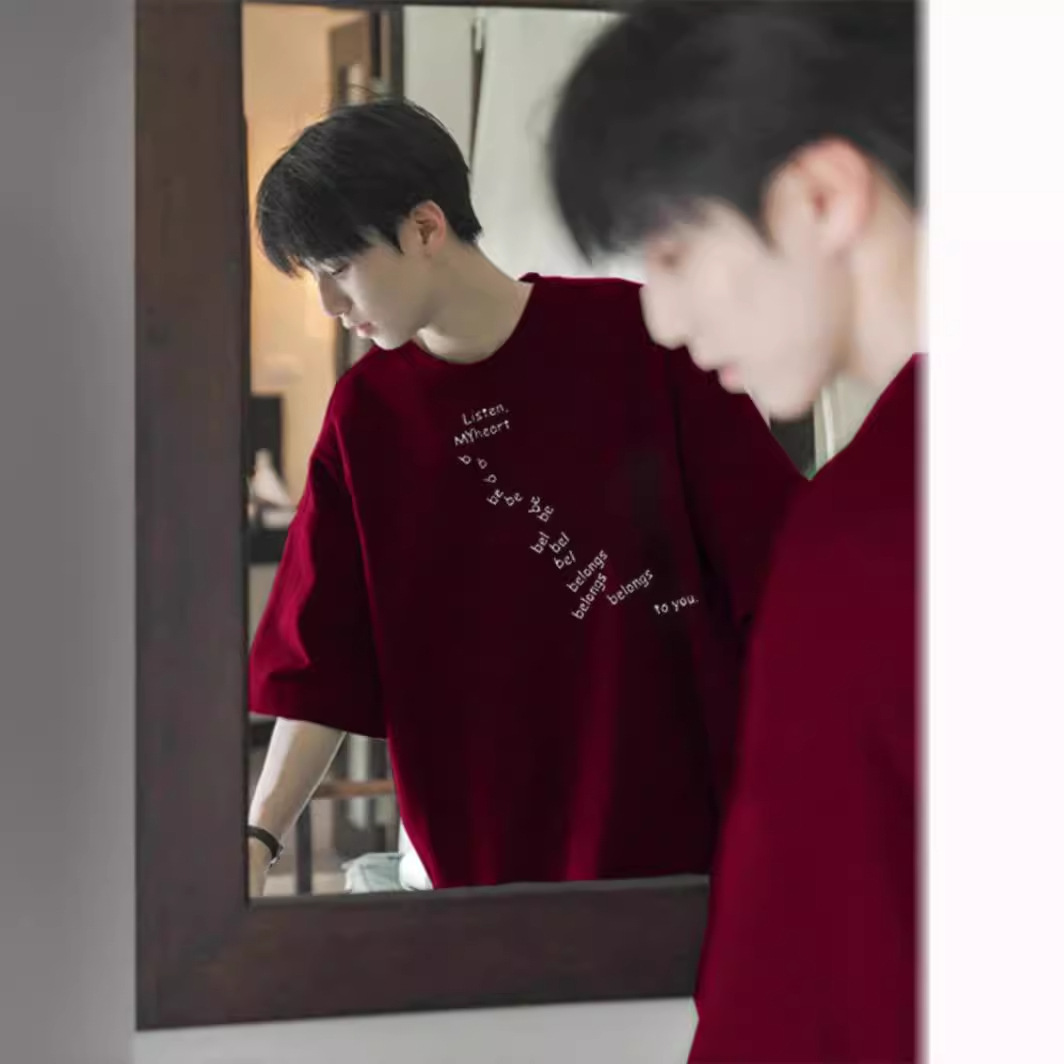 美式复古酒红色重磅t恤男设计感小众cleanfit短袖夏季半截袖情侣