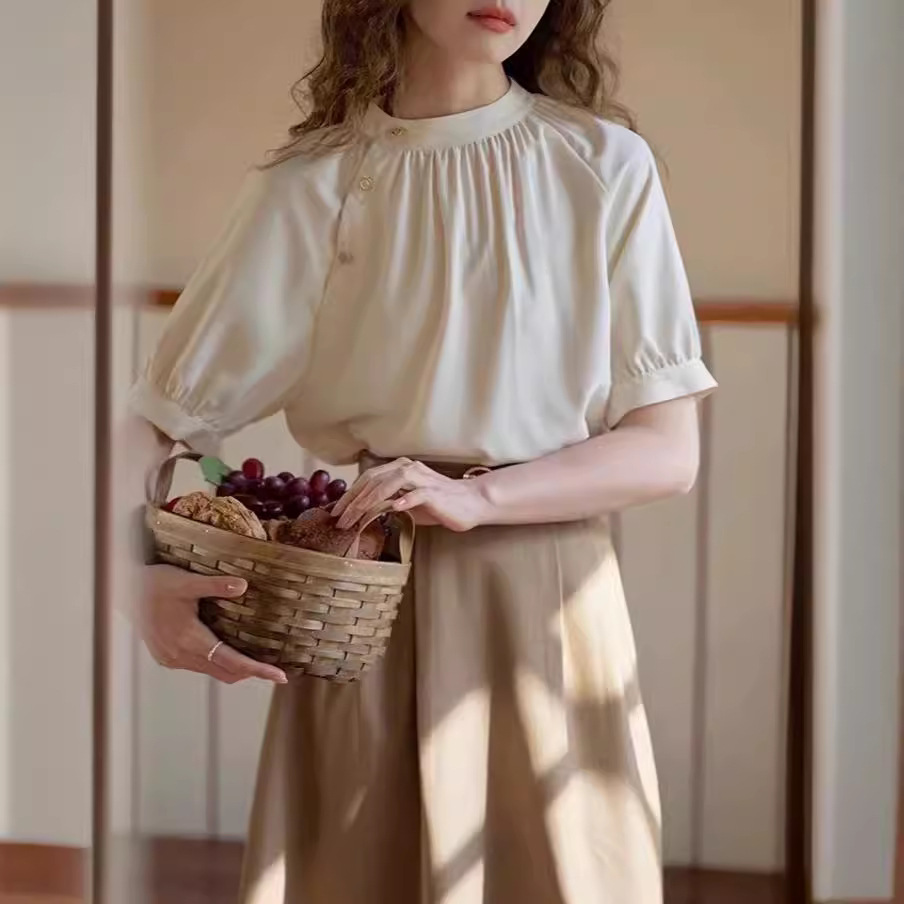 新中式国风别致斜扣缎面衬衫女夏新款复古宫廷风立领杏色衬衣