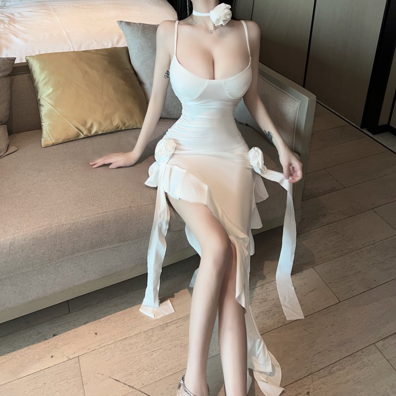纯欲气质性感辣妹低胸花朵不规则度假白色长裙开叉荷叶边连衣裙女
