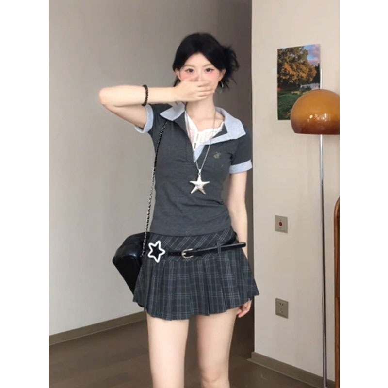 韩版学院风polo领撞色拼接短袖t恤百褶短裙两件套女夏季新款套装