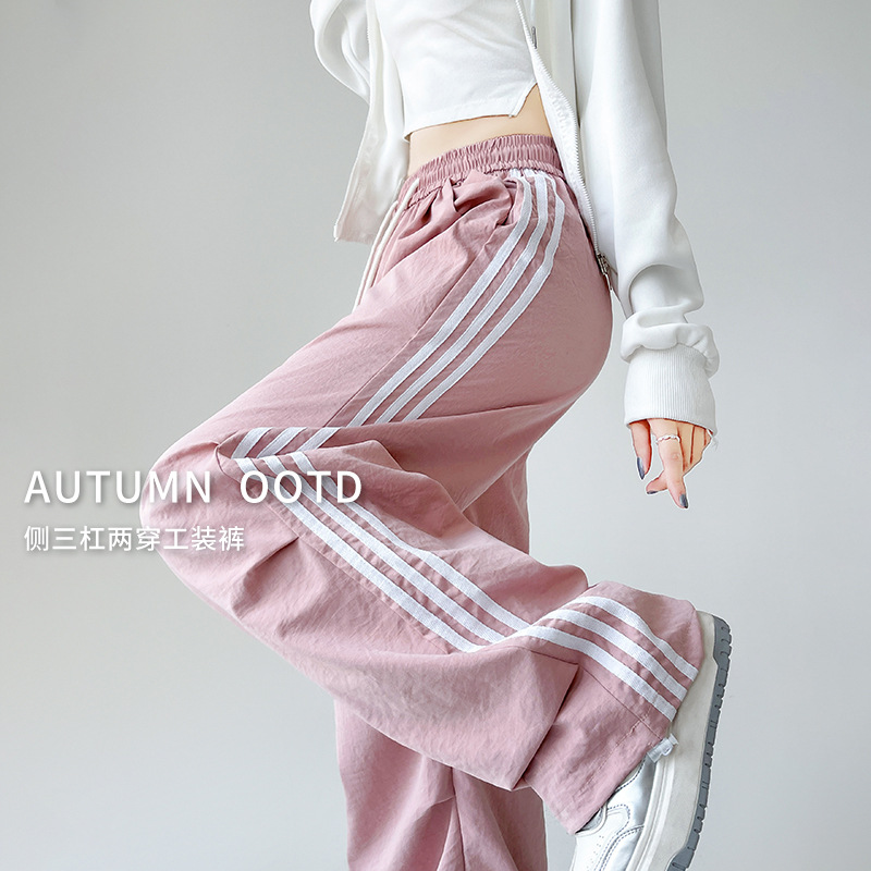美式降落伞工装裤女春秋新款高腰侧三杠休闲两穿小个子阔腿长裤子
