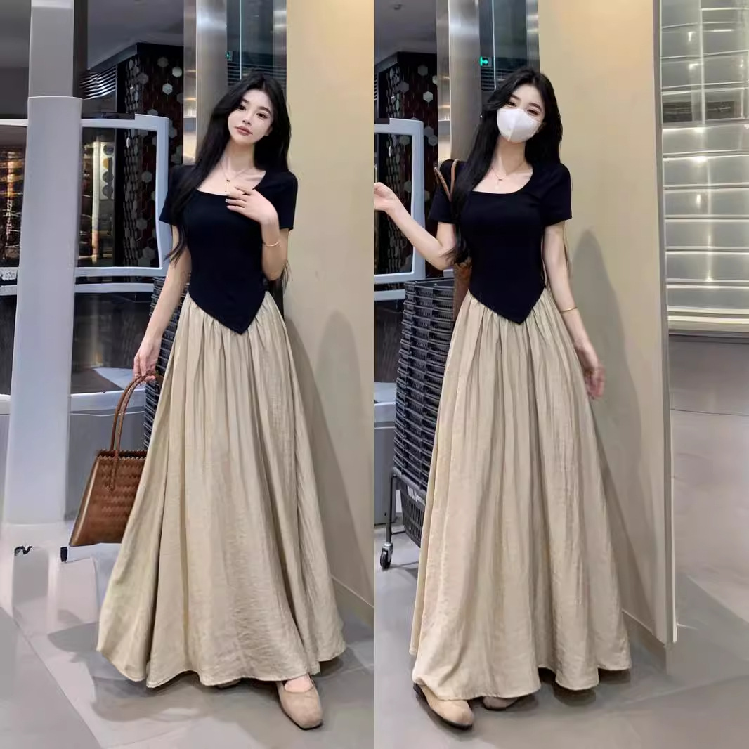 新款实拍~ 国风新中式假两件收腰显瘦拼接方领中长款连衣裙