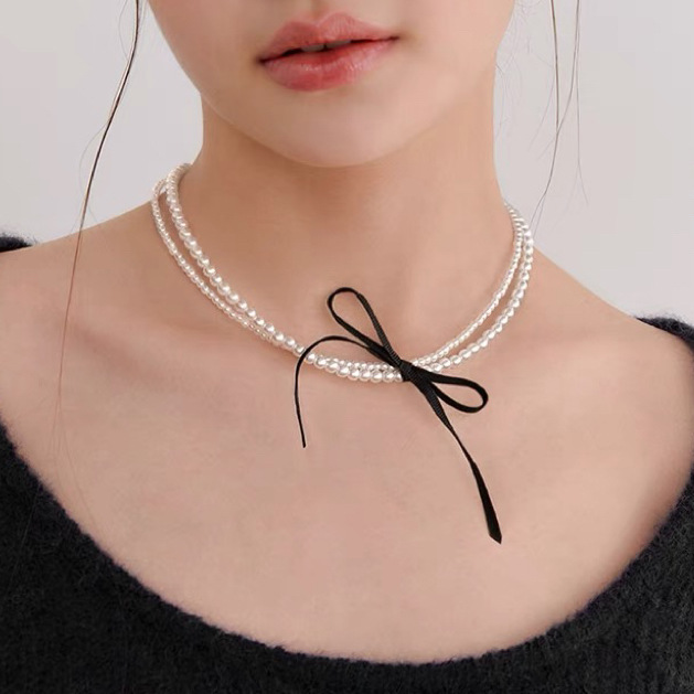 日韩甜美双层珍珠绑带蝴蝶结锁骨链项链饰品女轻奢高级感项圈颈链