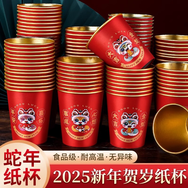 新年款一次性纸杯红色蛇年春节喜庆杯子加厚加硬金箔纸杯