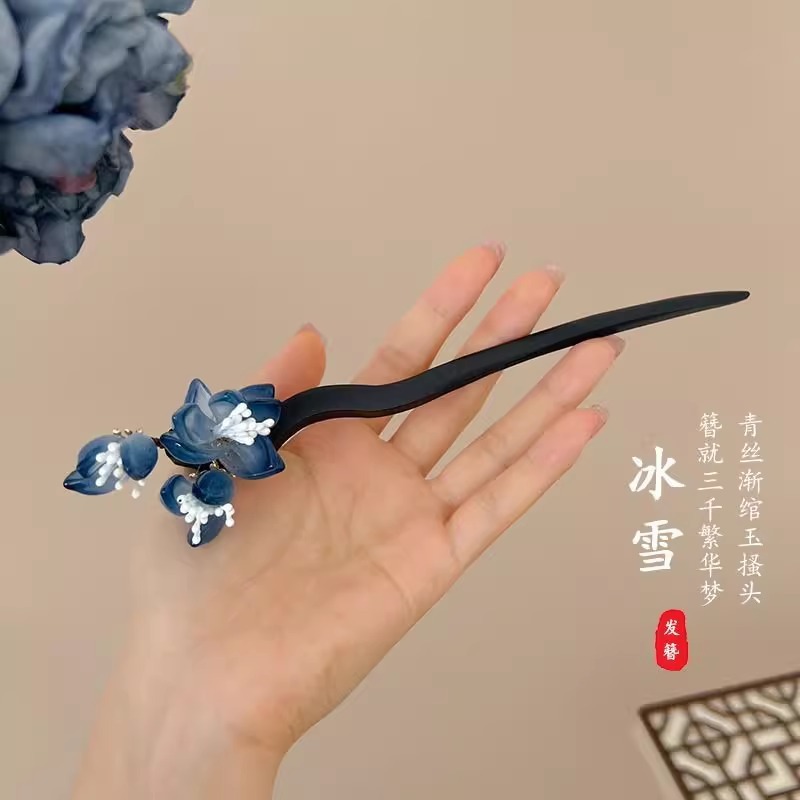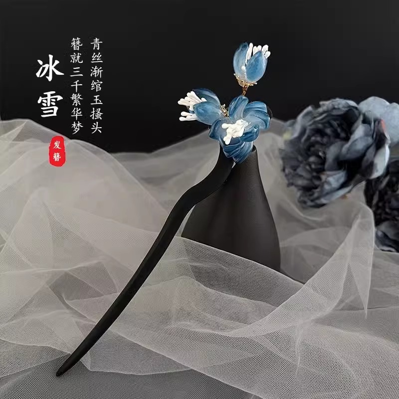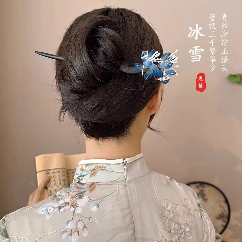 蓝色玉兰花发簪古风简约木簪盘发丸子头