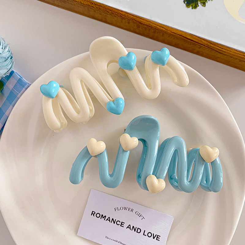 奶油蓝爱心波浪发夹女后脑勺盘发抓夹鲨鱼夹子可爱发卡头饰夏清新