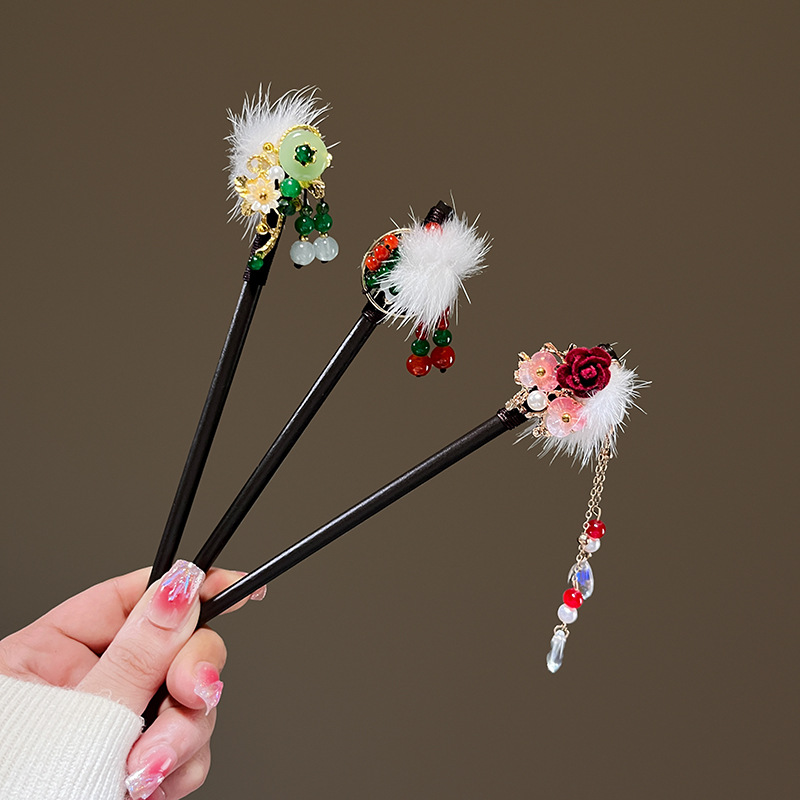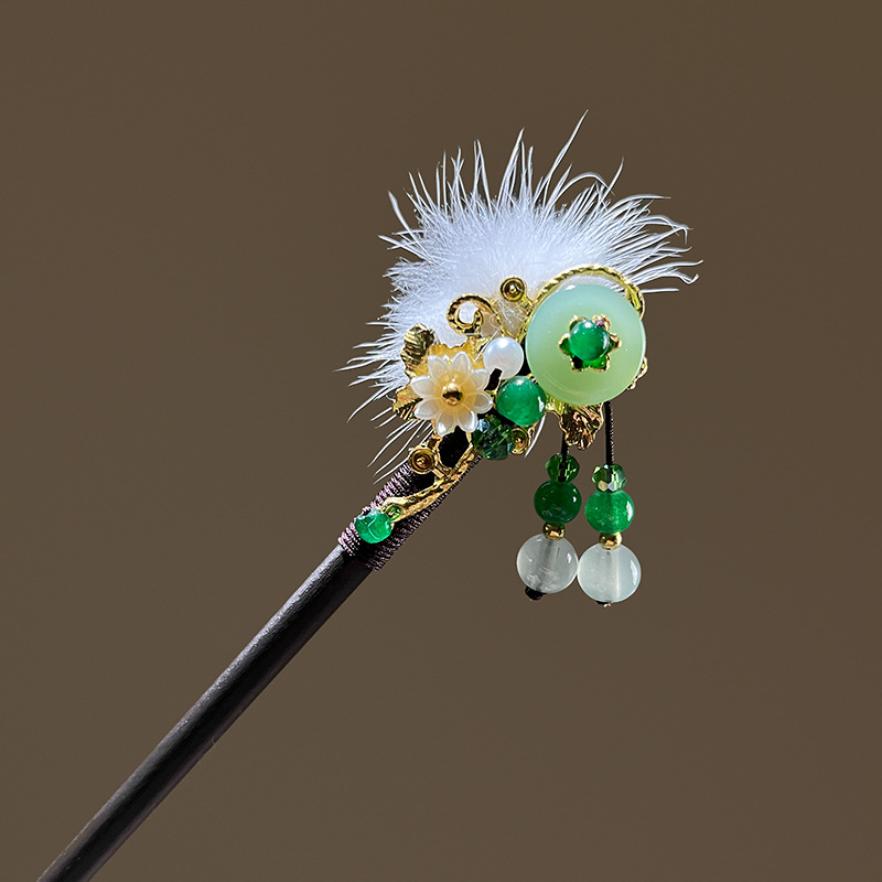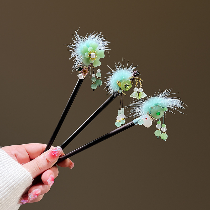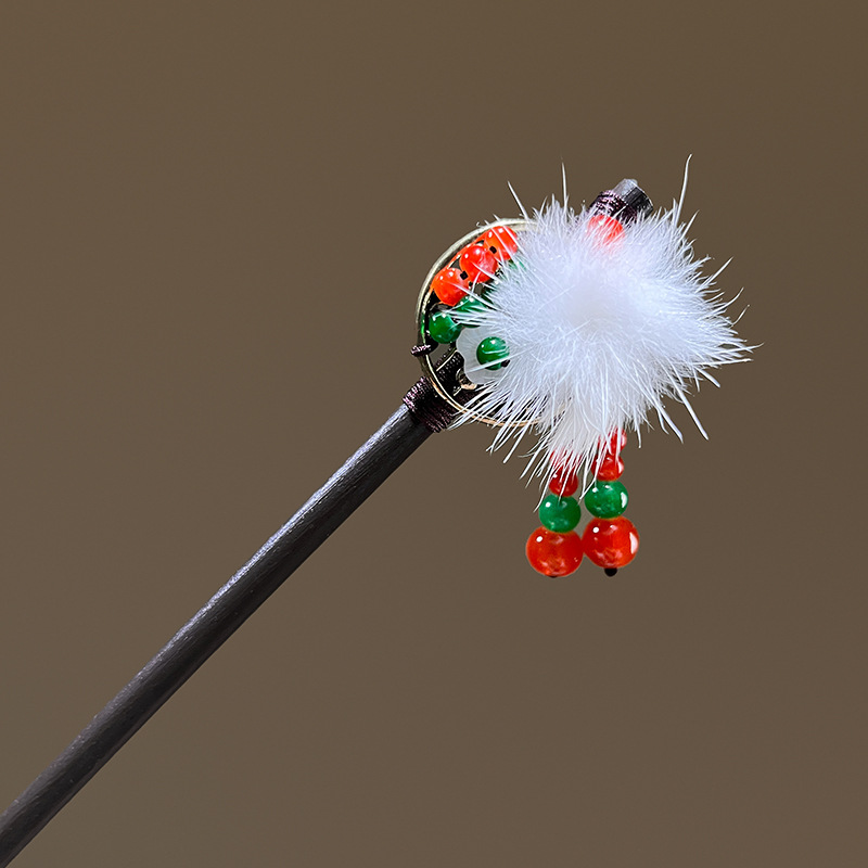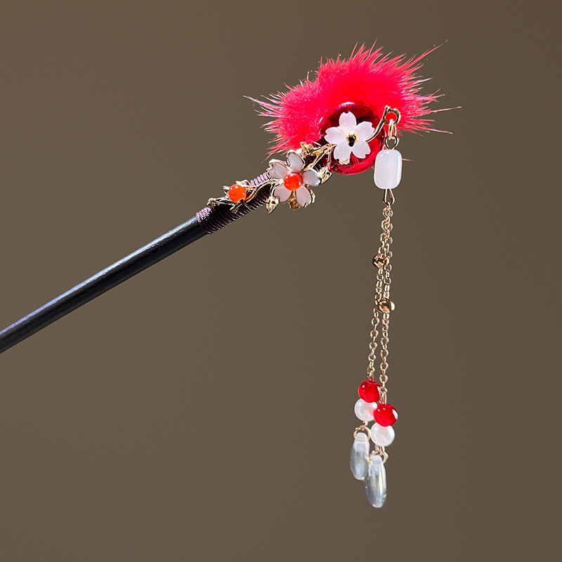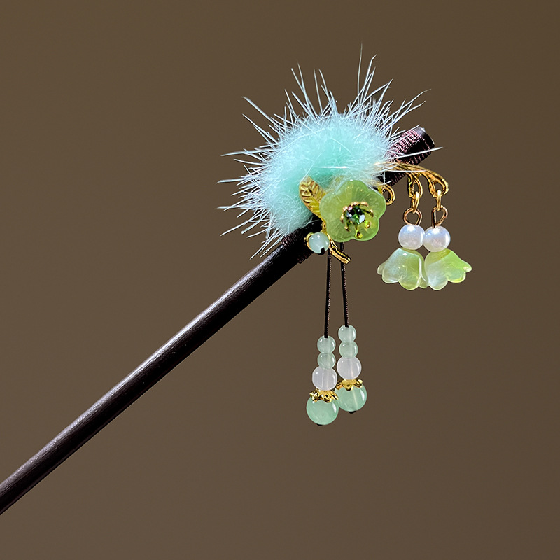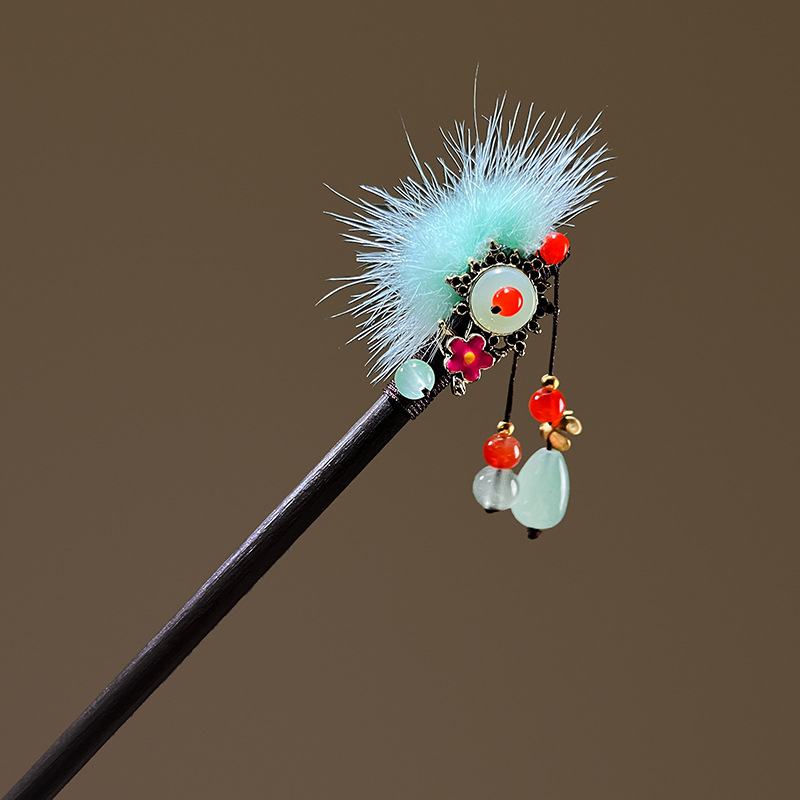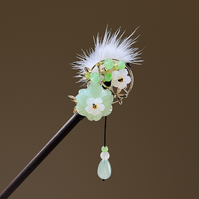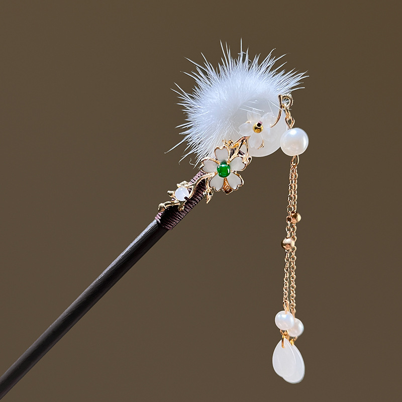 小仙女气质水貂毛发簪古风汉服旗袍盘发发钗中式流苏步摇禾木发饰