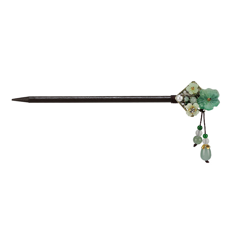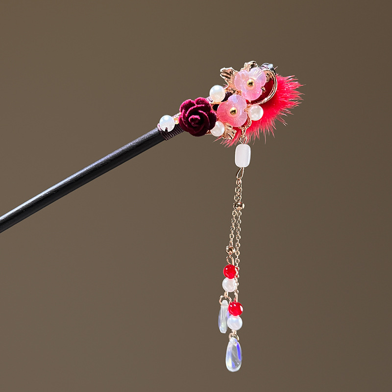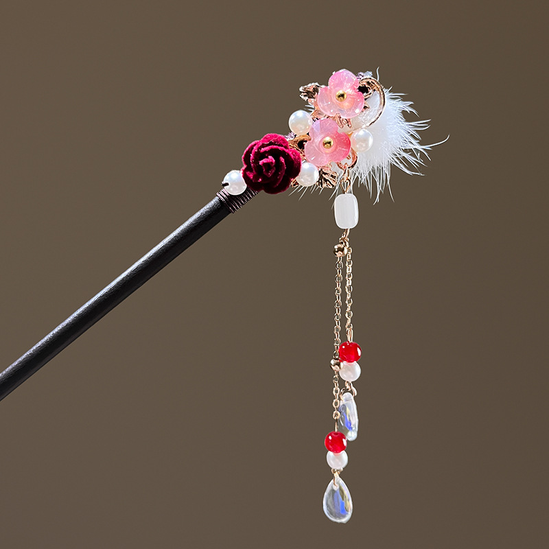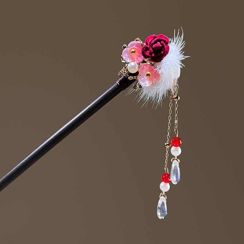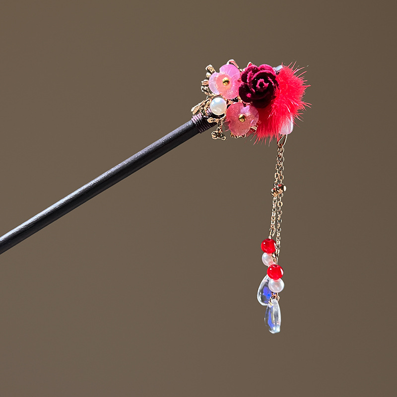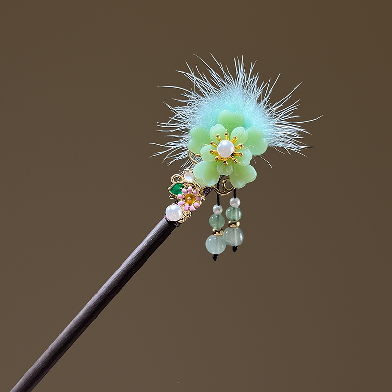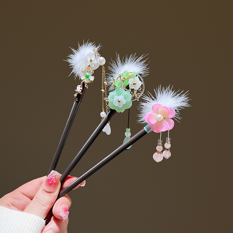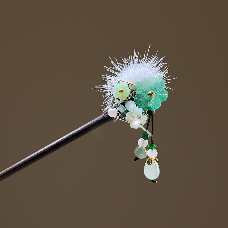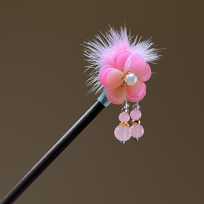 小仙女气质水貂毛发簪古风汉服旗袍盘发发钗中式流苏步摇禾木发饰