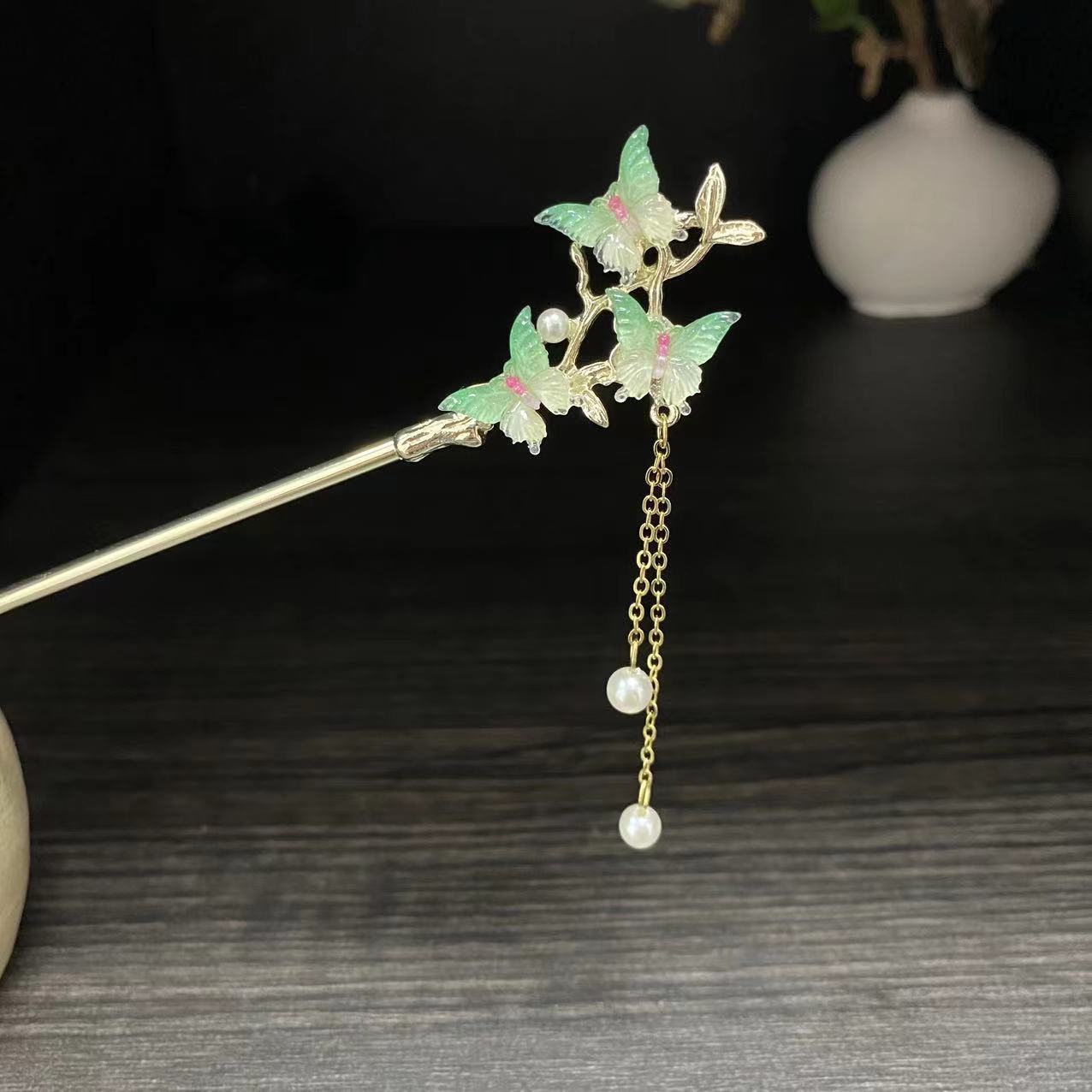 新中式蝴蝶流苏发簪古风高级感步摇簪子旗袍后脑勺盘发发钗头饰