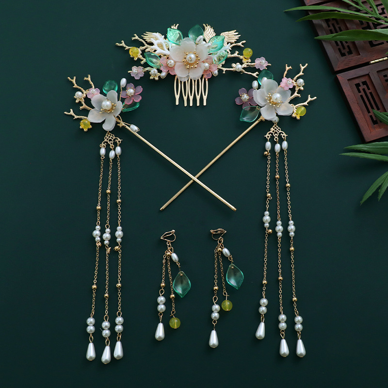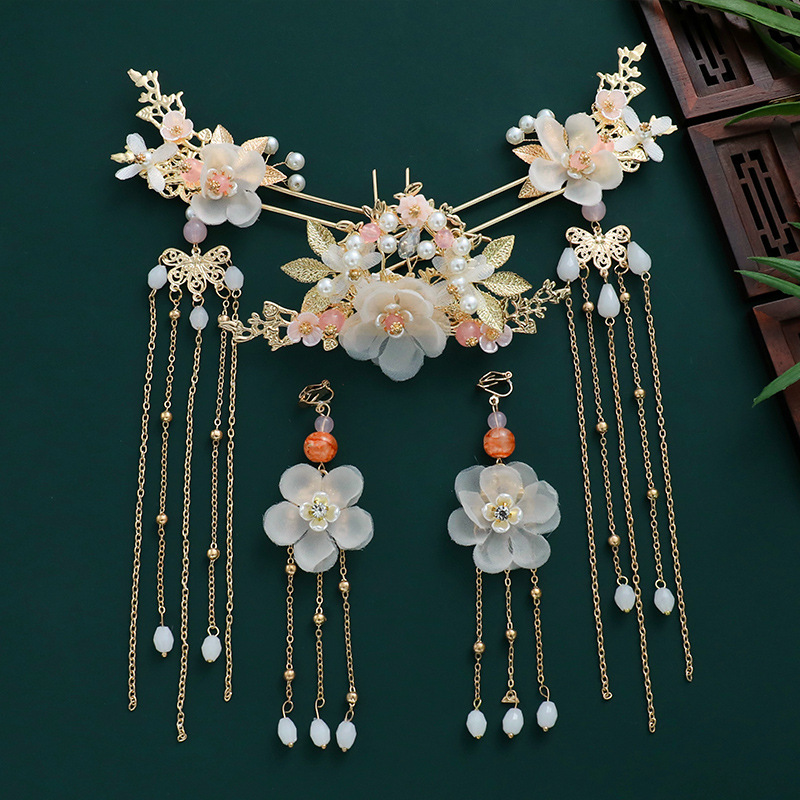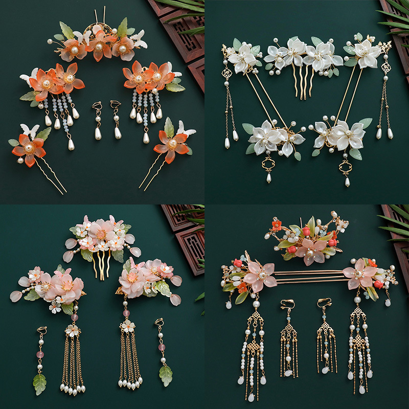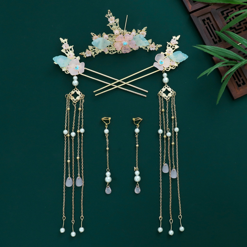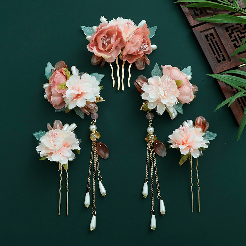 古风发簪儿童汉服发钗耳夹头饰牡丹花朵流苏发梳女孩古装发饰组合