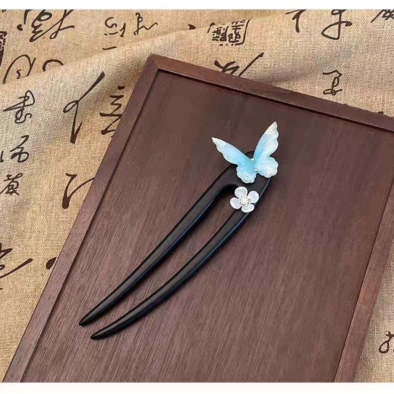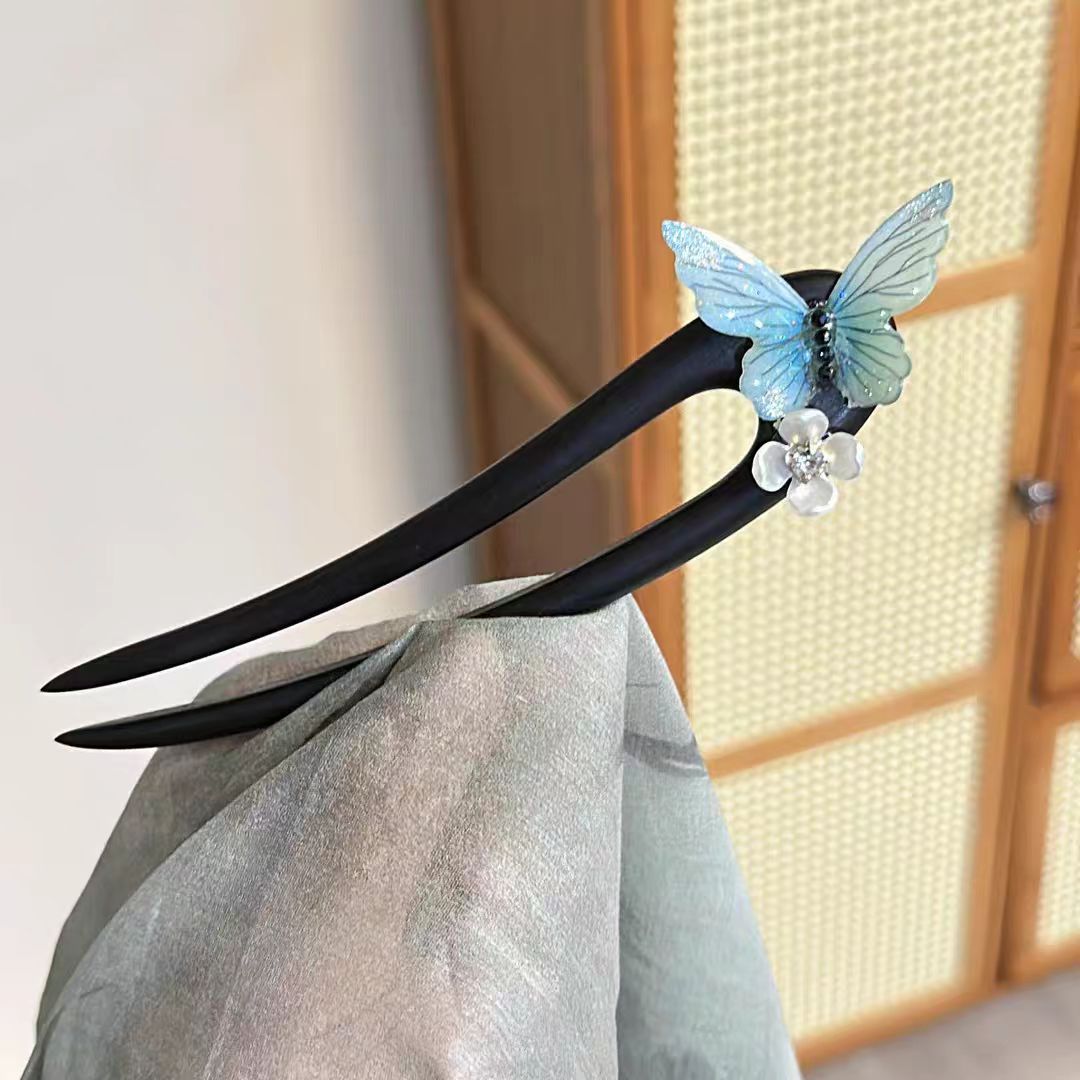 清冷感国风蓝蝴蝶木簪女花朵U型仙气发簪新中式马面裙汉服发钗头
