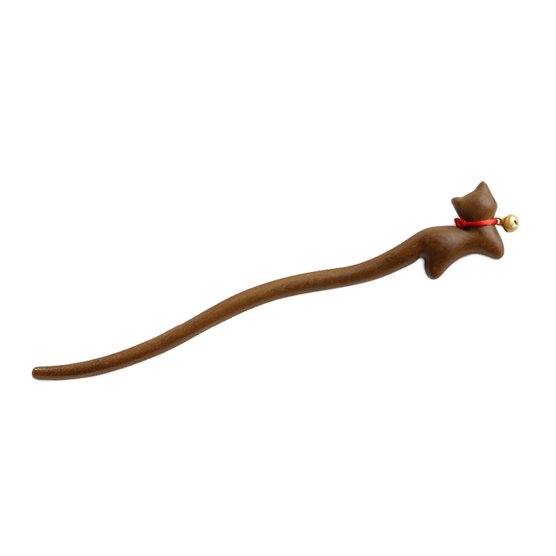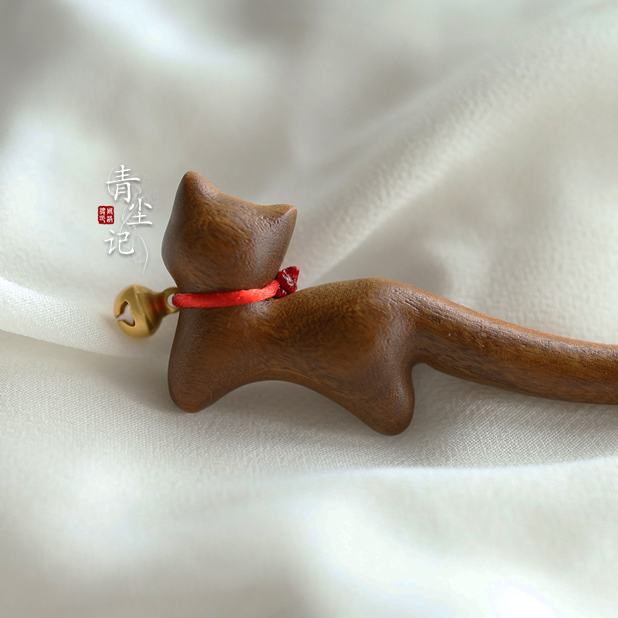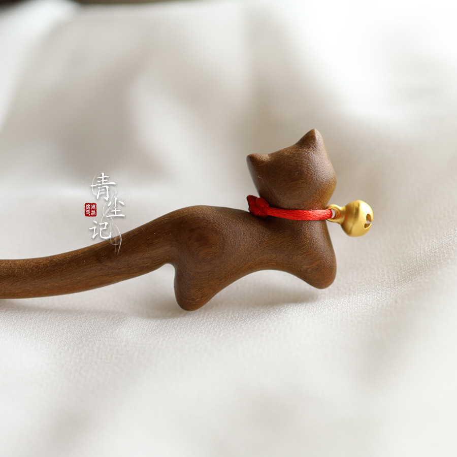 叮当猫檀木小猫咪发簪铃铛招财原创盘发簪子古风个性