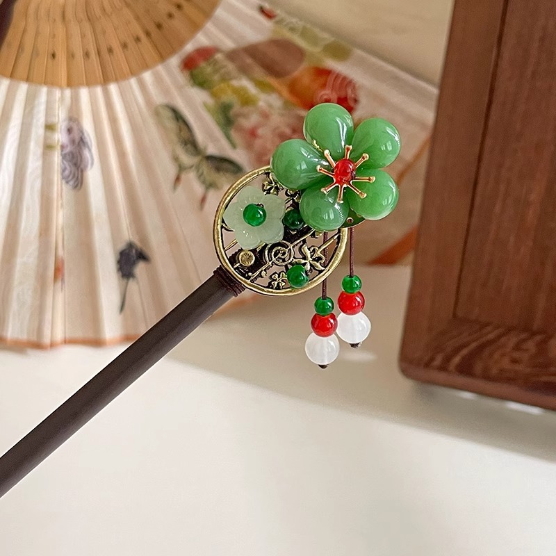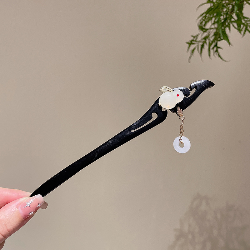 66#绿叶兔子流苏红珠发簪 (袋装)