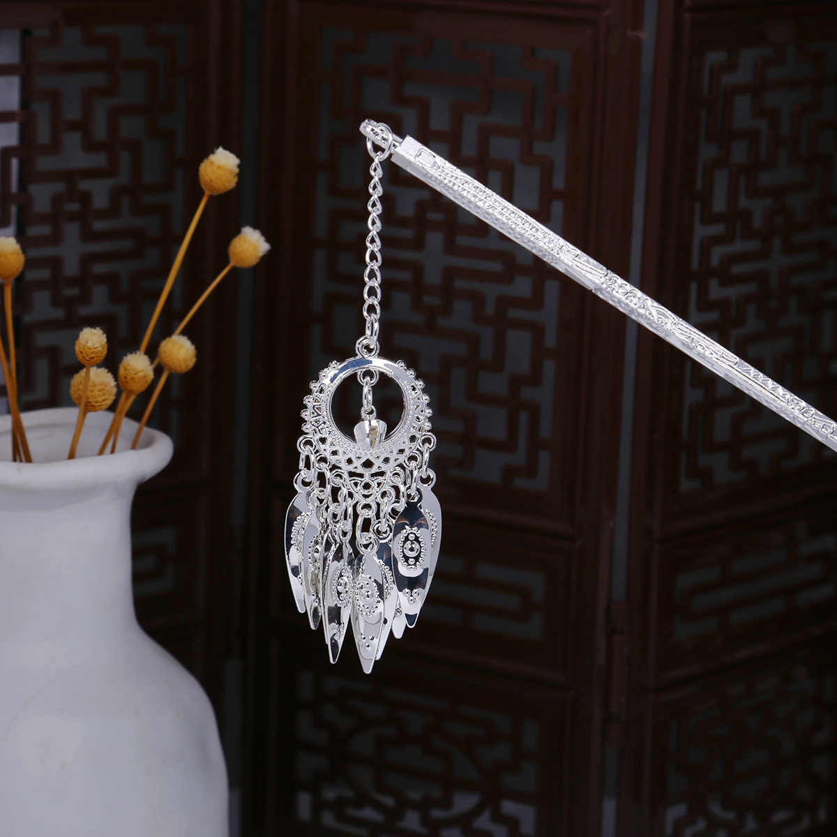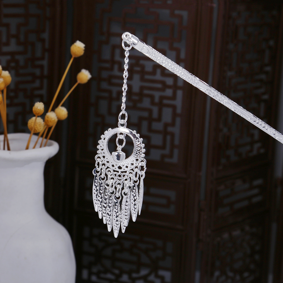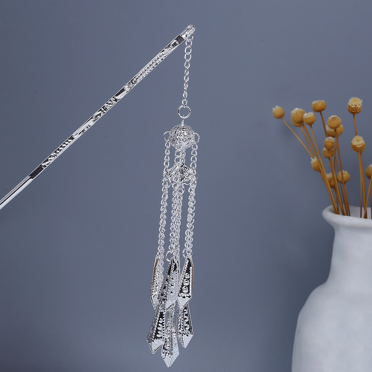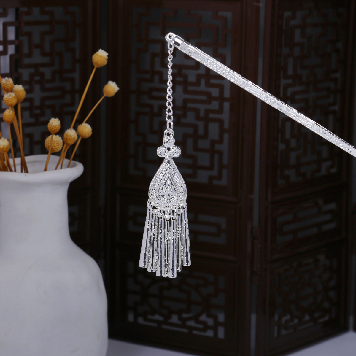 新中式苗银几何镂空步摇流苏发簪 复古孔雀流苏古风旗袍汉服发饰