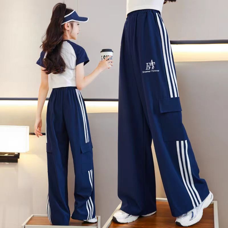 女童阔腿裤夏季薄款儿童防蚊裤直筒冰丝裤子套装夏装女大童工装裤