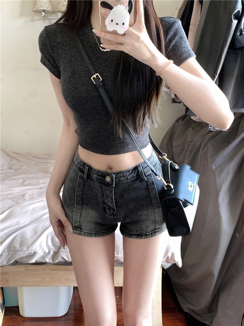 美式复古蓝新款弹力修身高腰牛仔短裤女夏季薄款显瘦包臀热裤a字