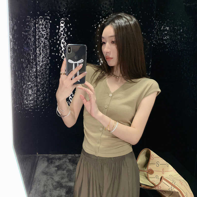 夏秋季新款锁骨针织T恤新款打底针织衫V领开衫短款短袖上衣女