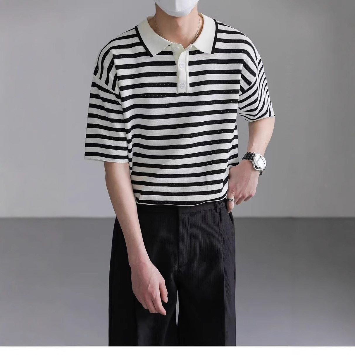 设计感镂空条纹翻领POLO衫男短袖T恤夏季上衣潮流宽松半袖体恤男