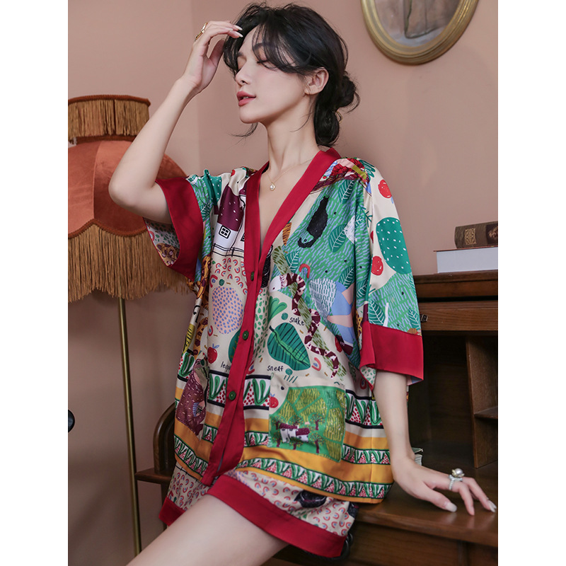 睡衣女款夏季冰丝原创短袖休闲开衫薄款套装宽松大码家居服可外穿