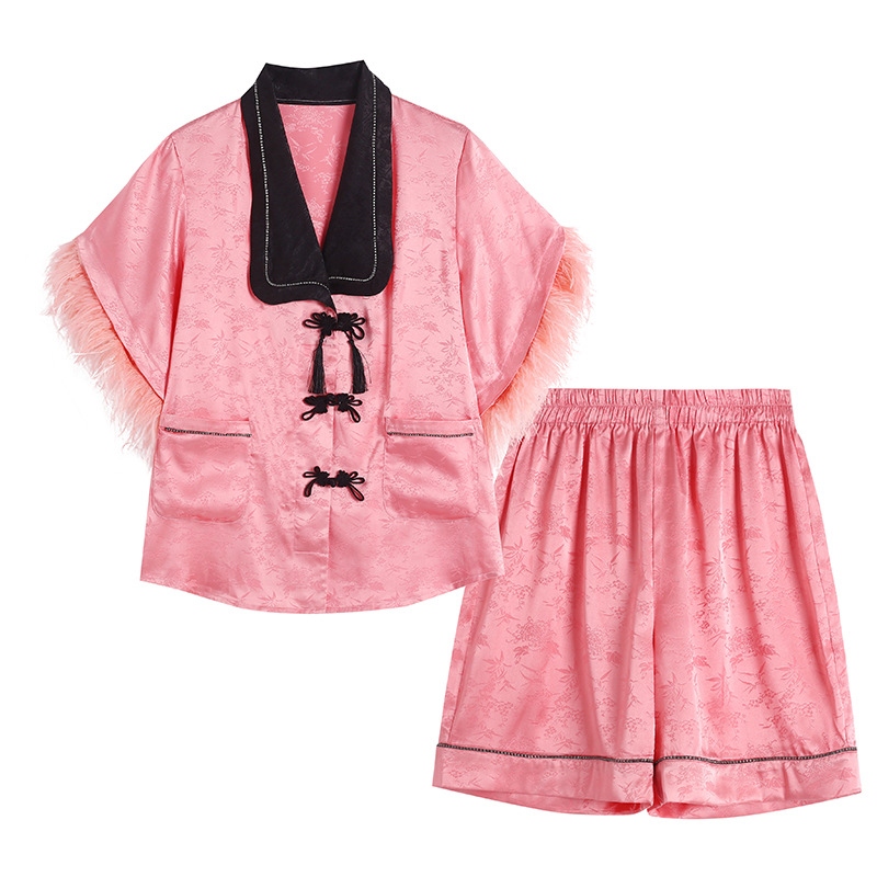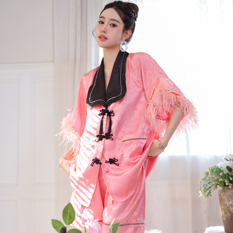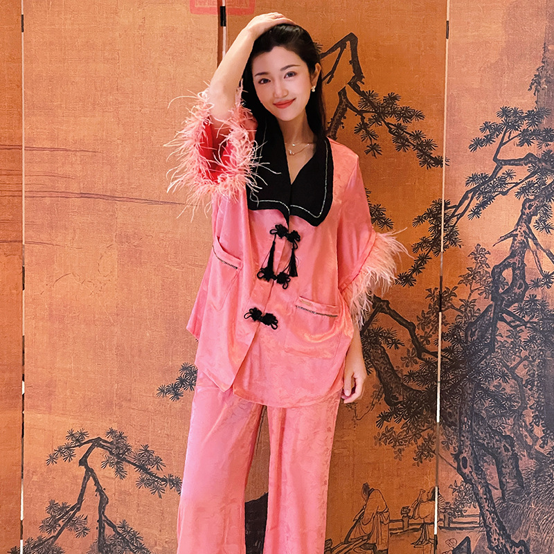 奢华可拆卸鸵鸟毛仿真丝冰丝睡衣两件套水钻盘扣缎面家居服新
