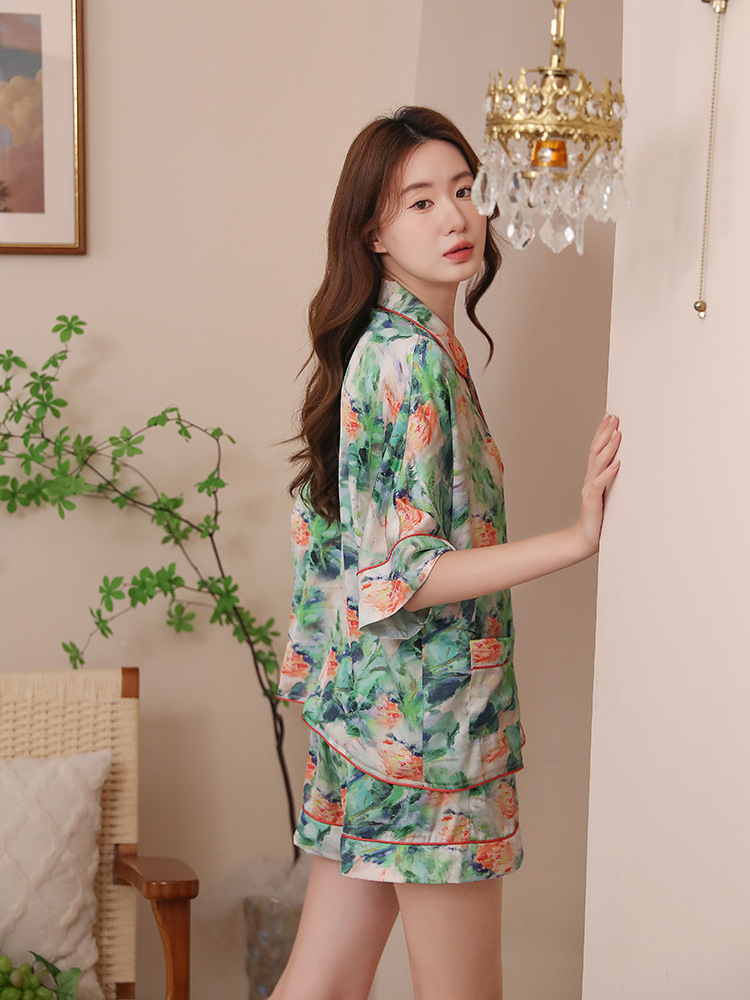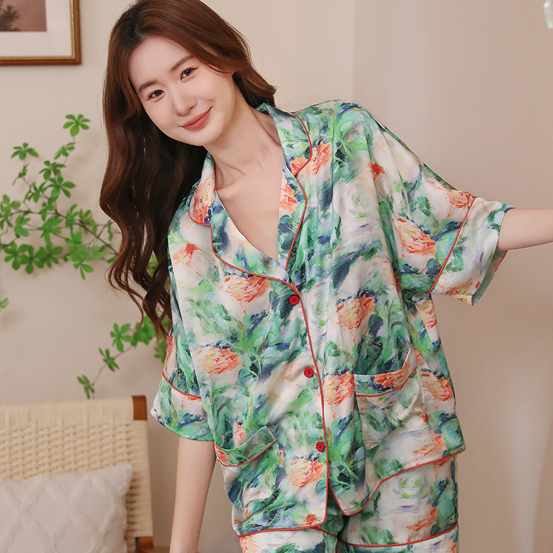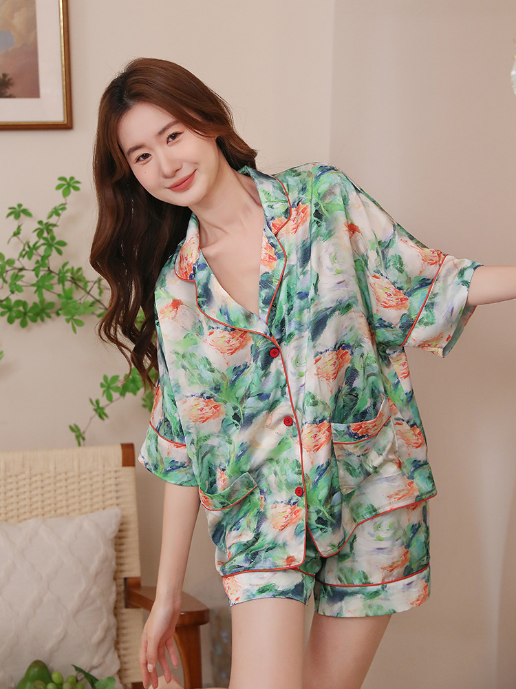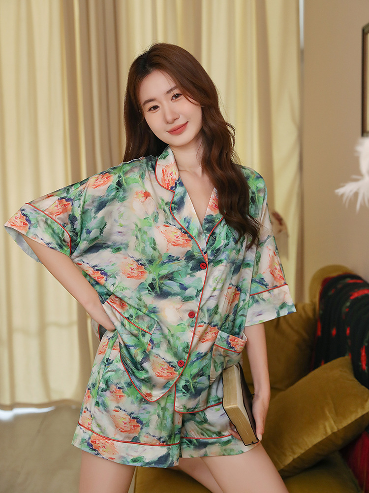 夏新款时尚轻奢短裤短袖冰丝睡衣女家居服绸缎印花薄款宽松