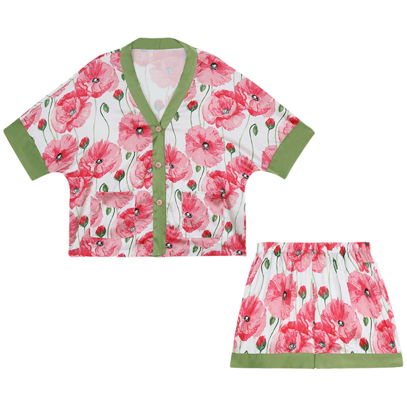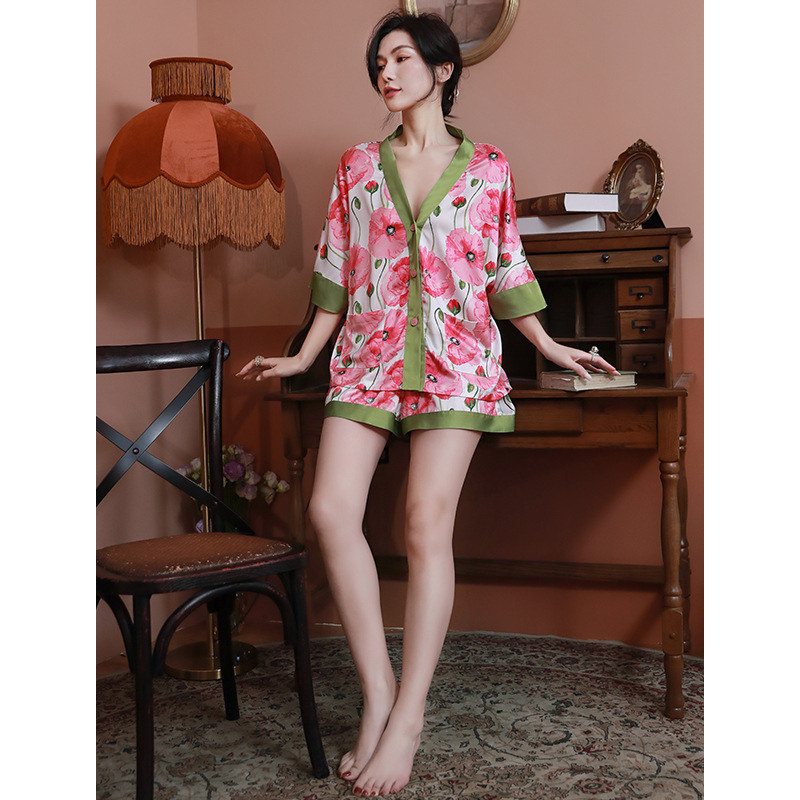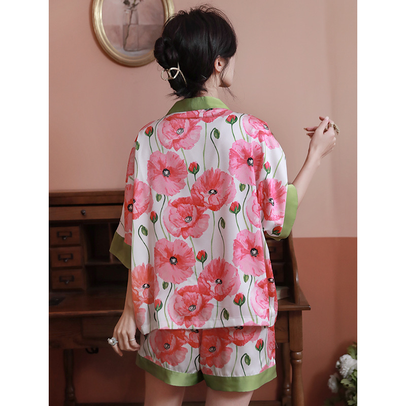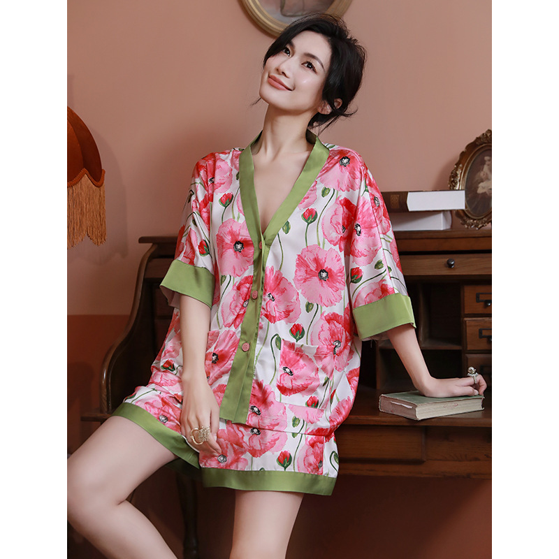 睡衣女夏款印花开衫凉感宽松仿真丝短袖短裤套装高级感