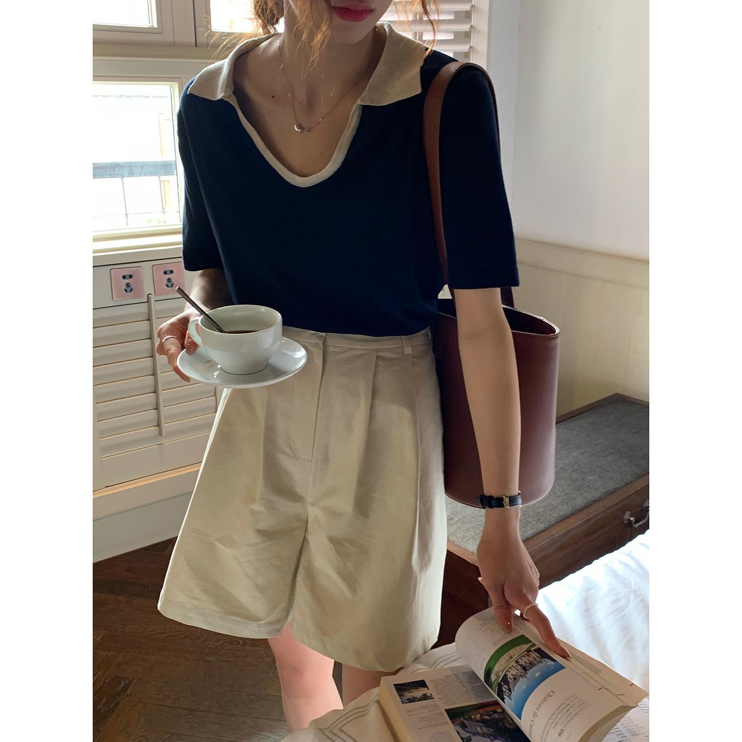 短袖T恤女夏季POLO领复古设计感体恤百搭撞色翻领显瘦上衣