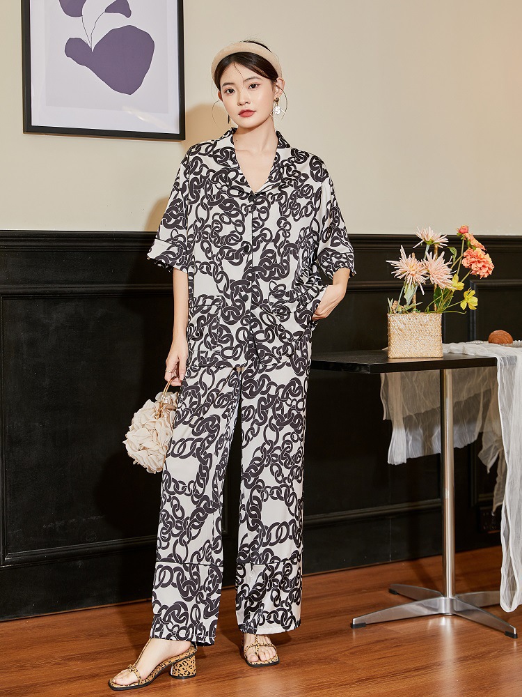 扭结印象冰丝睡衣女新款春秋短袖长裤两件套装外穿家居服
