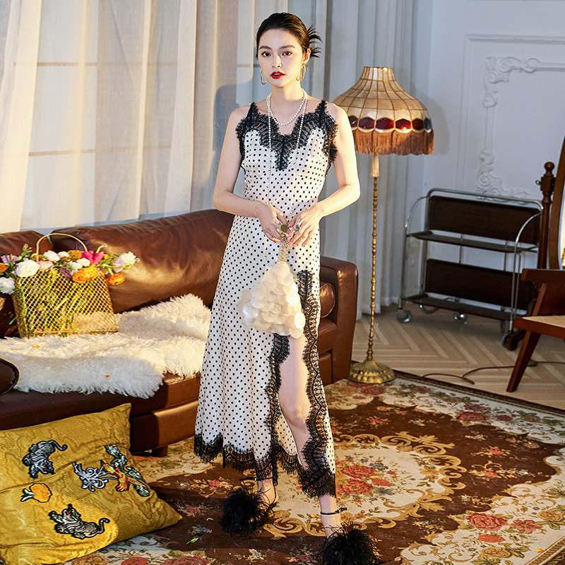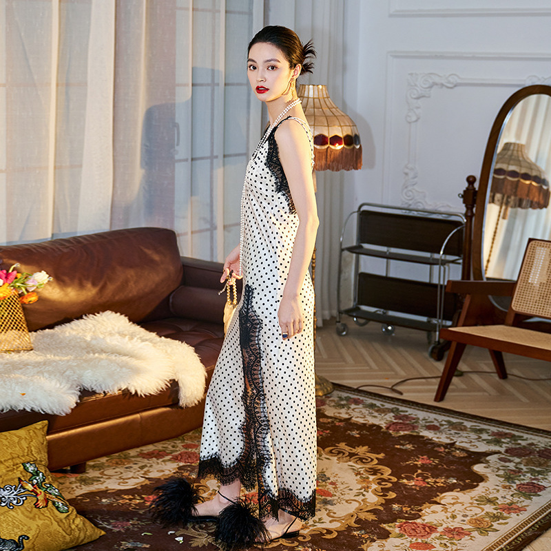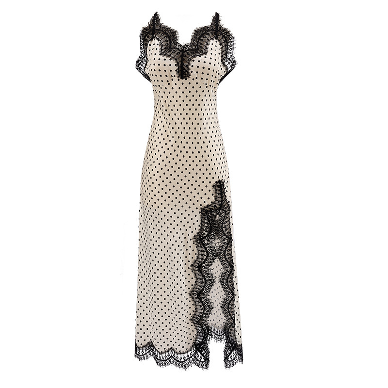 夏天波尔卡波点冰丝蕾丝拼接性感中长款吊带睡袍晨袍睡裙家居服