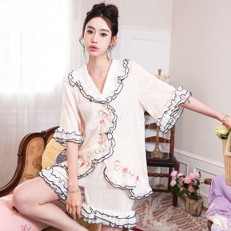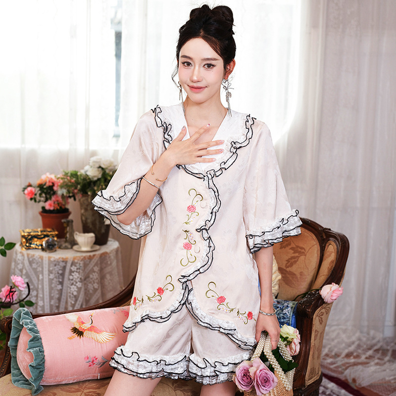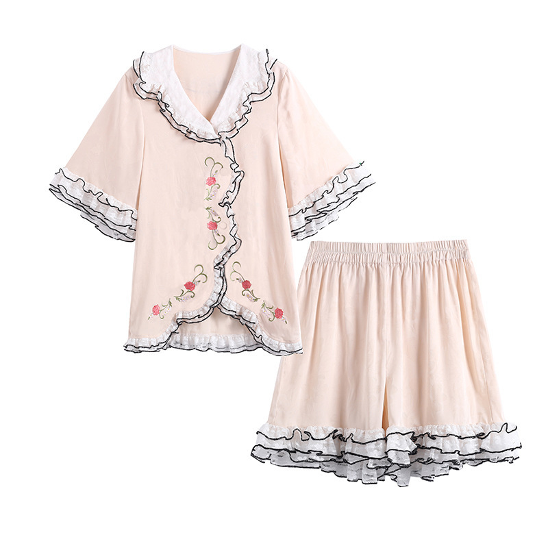 蕾丝荷叶边绣花睡衣两件套仿真丝冰丝宽松缎面家居服可外穿新