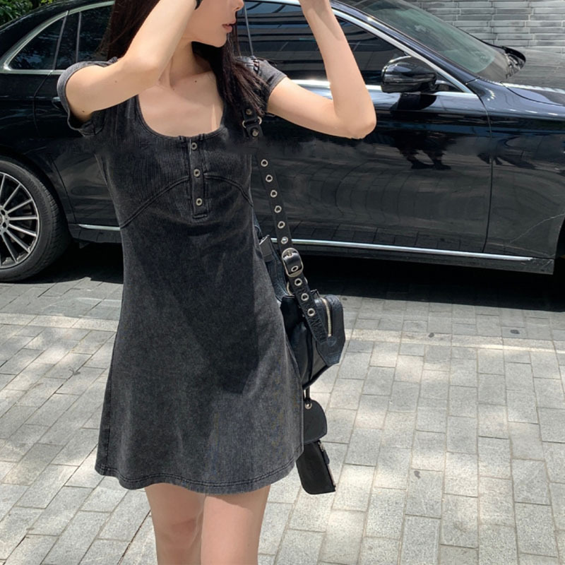 灰色方领短袖连衣裙女夏季新款气质收腰显瘦a字修身裙子潮