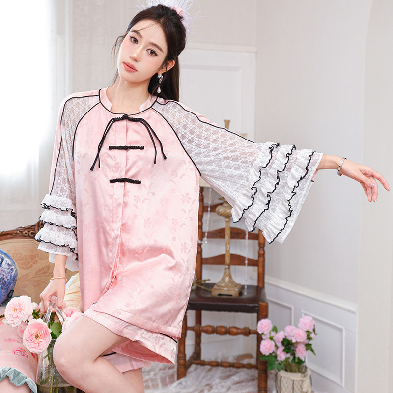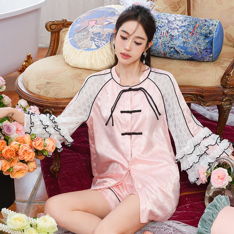 新中式蕾丝睡衣两件套缎面宽松舒适仿真丝冰丝家居服七分袖短袖夏