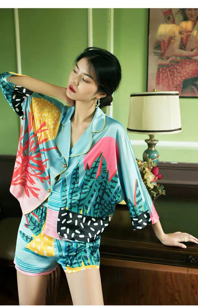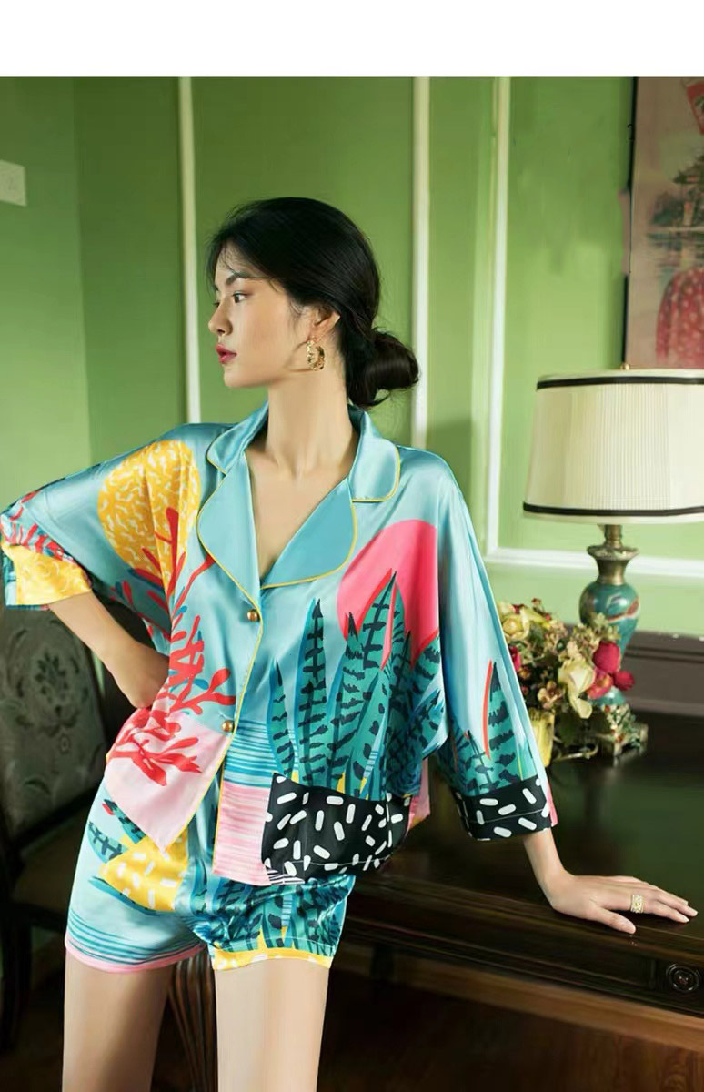 感冰丝睡衣女新款夏季薄款仙人掌短袖短裤两件套装家居服短袖