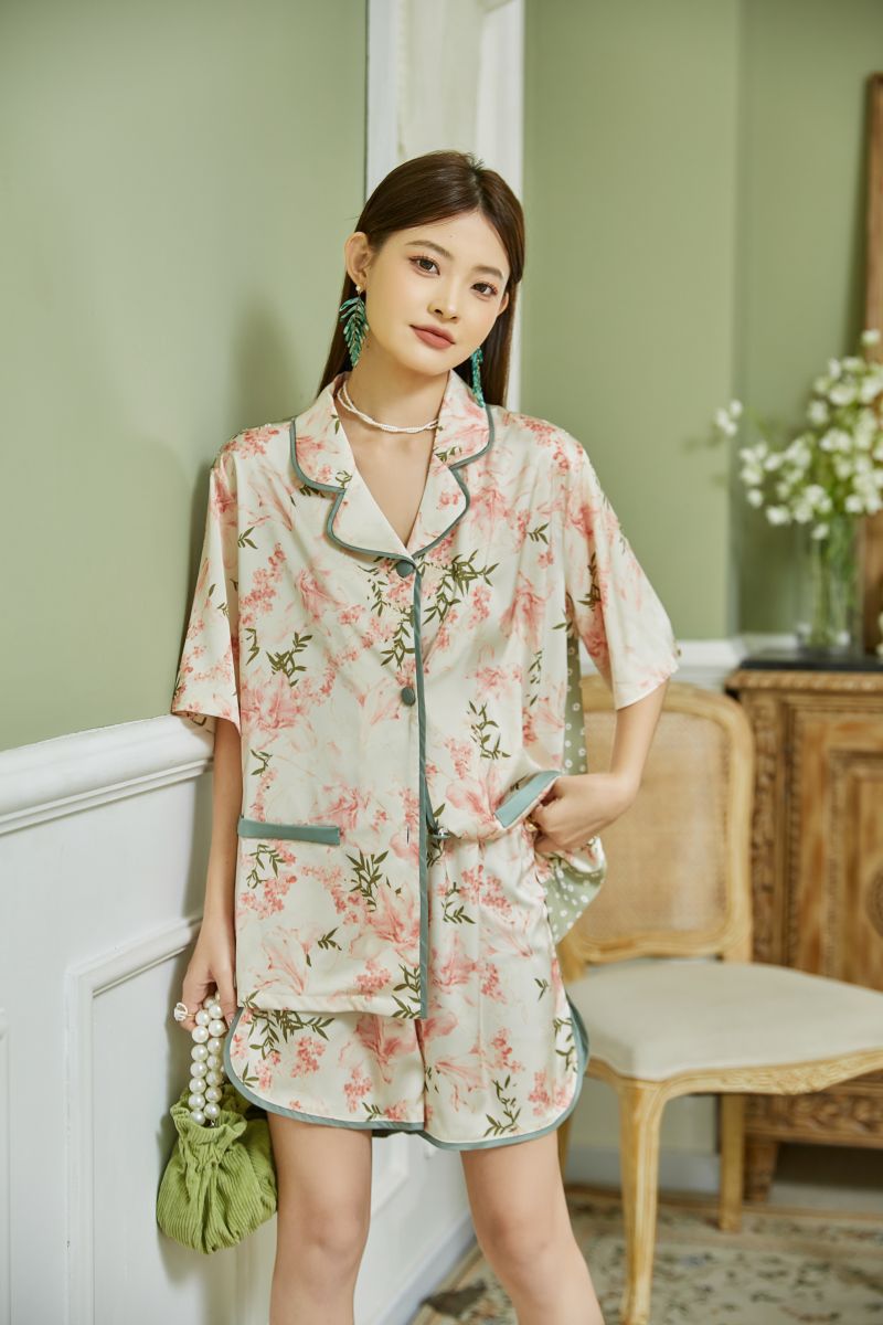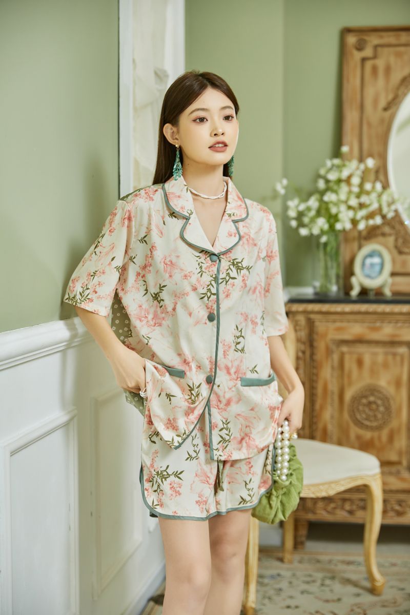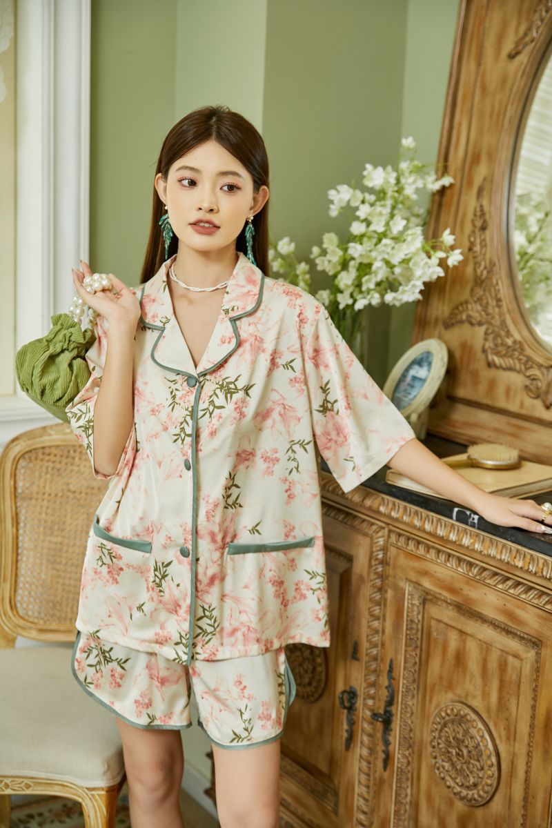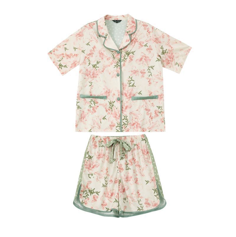 复古花卉冰丝睡衣女夏季薄款短袖短裤两件套装家居服可出门外穿