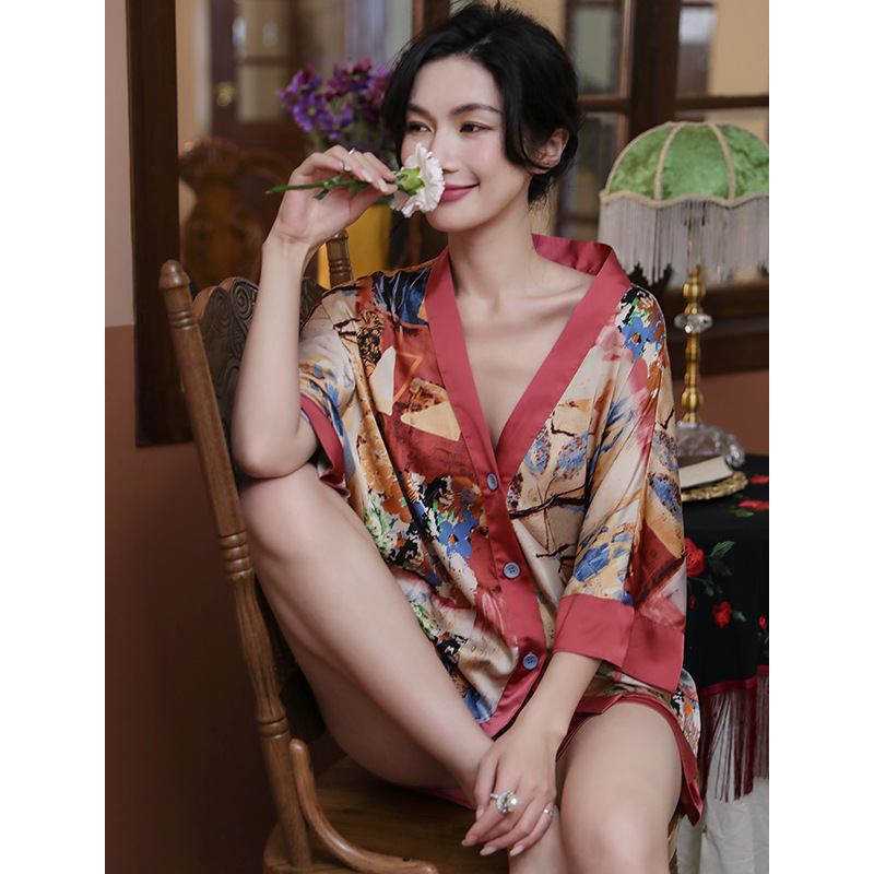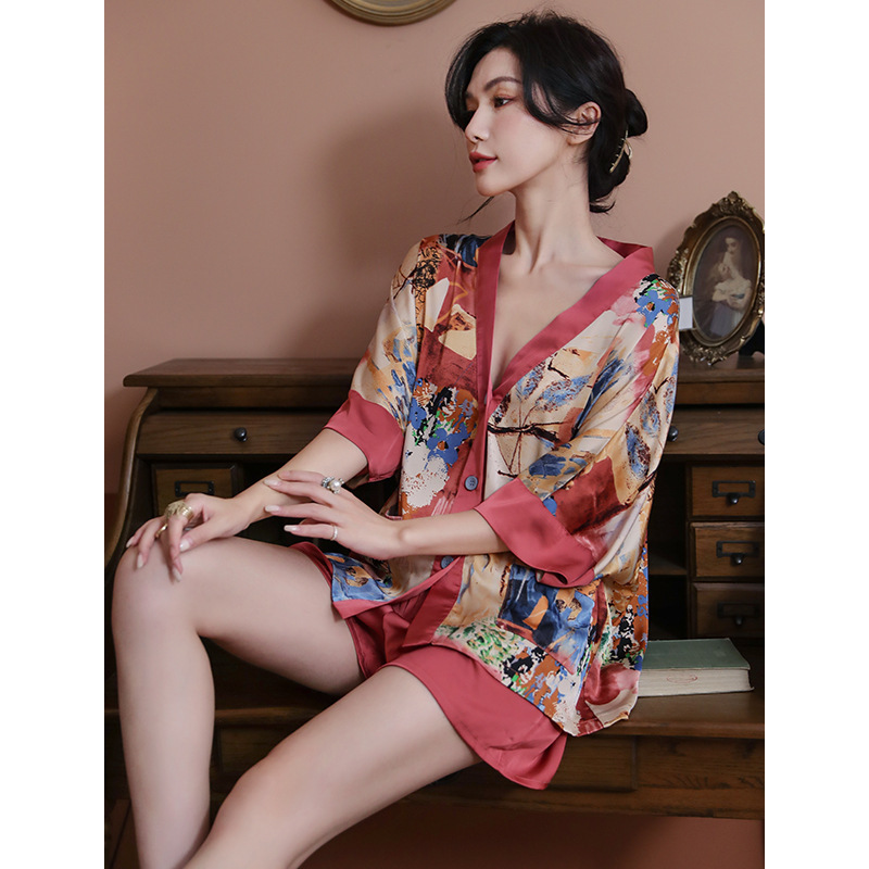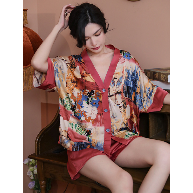 睡衣女夏款冰丝新款开衫时尚大码短袖短裤套装高级感可外穿