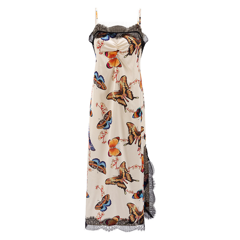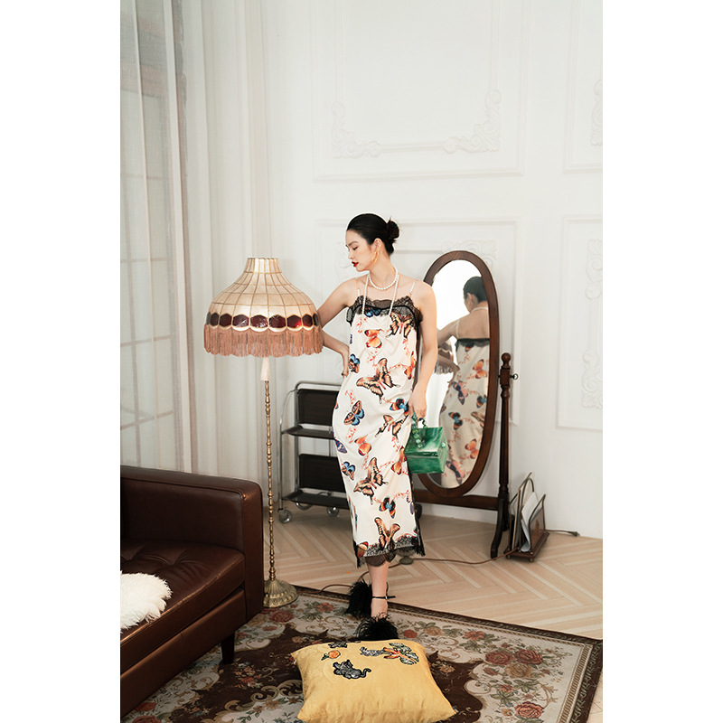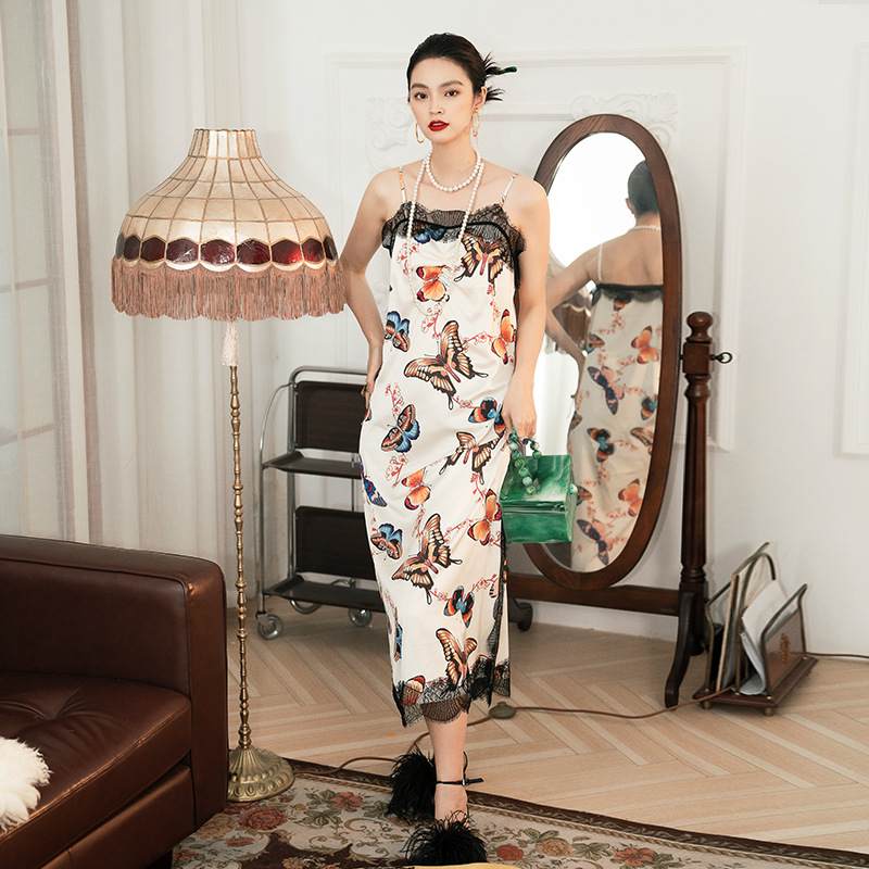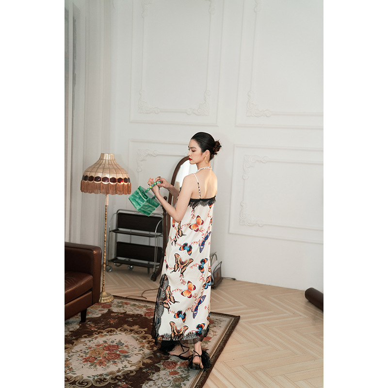 蝶恋花夏季印花蕾丝吊带睡袍晨袍连衣裙睡衣睡裙家居服
