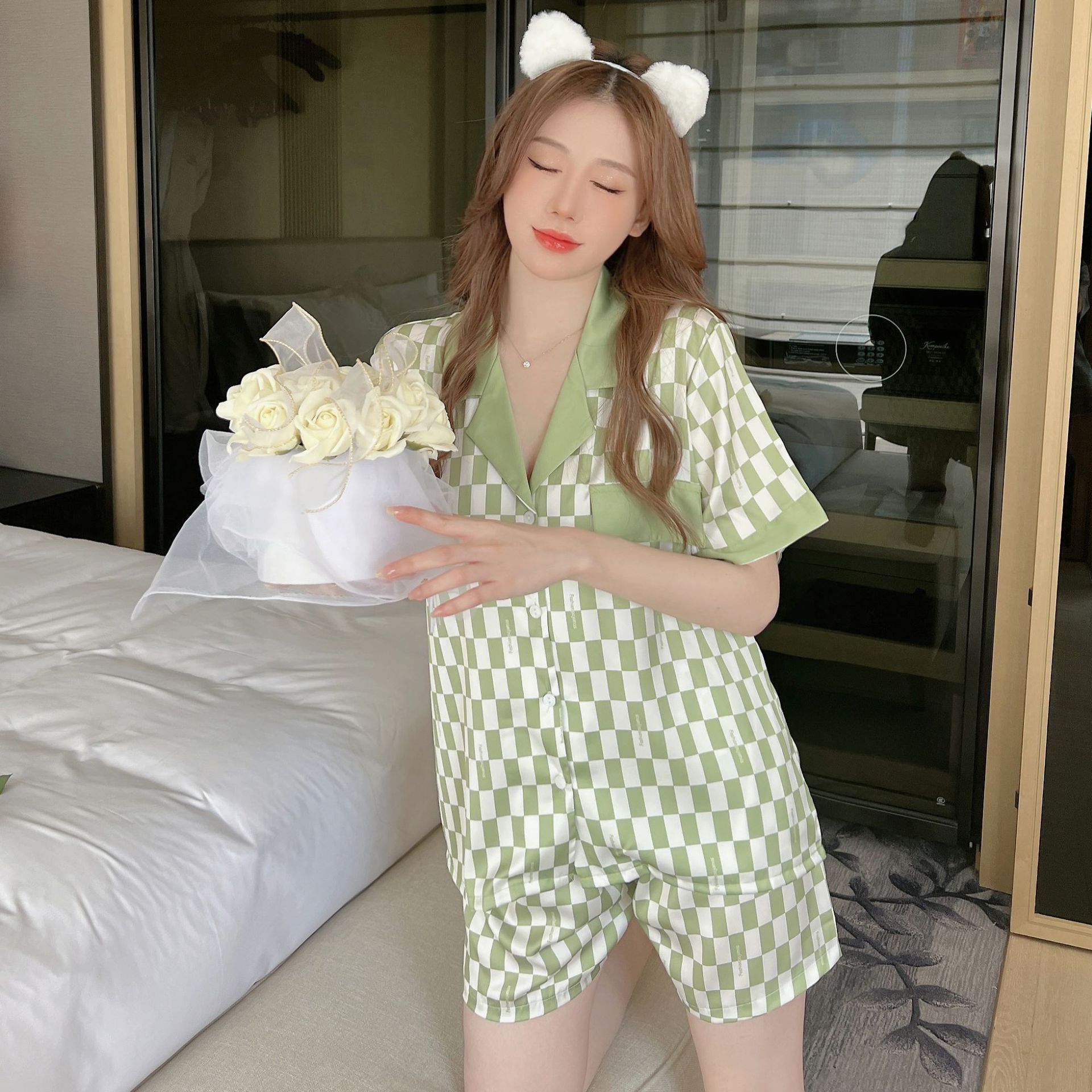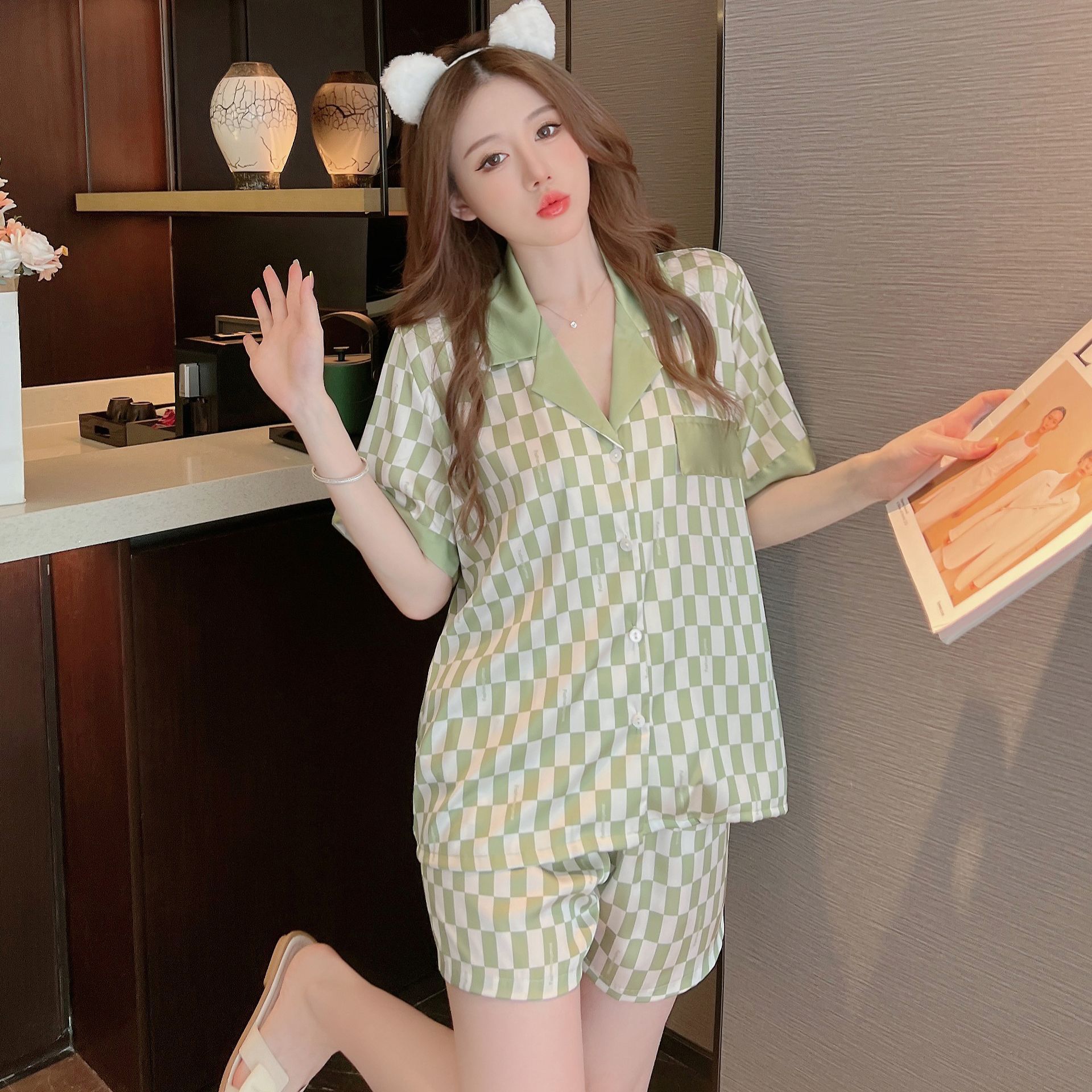 睡衣女夏季短袖短裤冰丝绸方格简约高级感新款网红款家居服