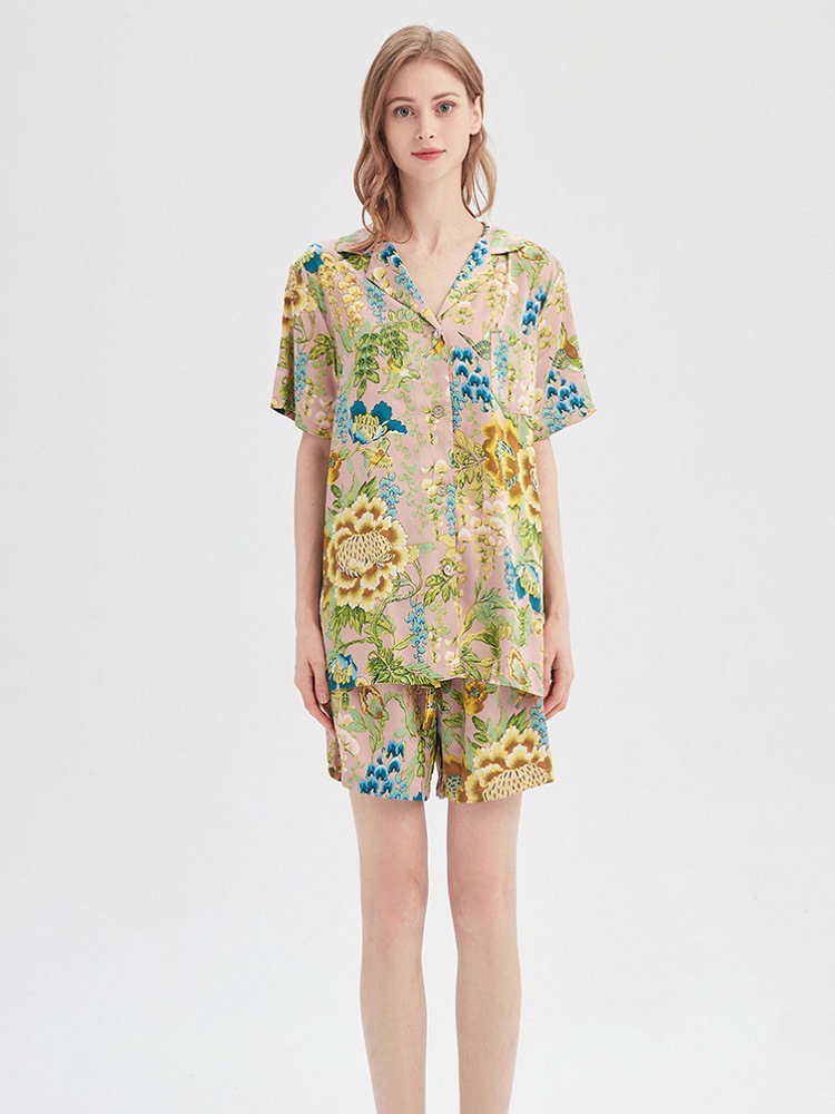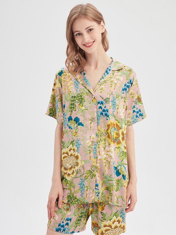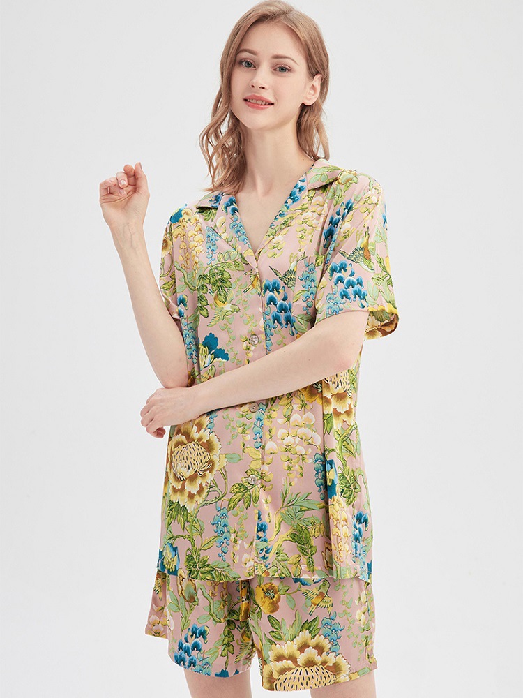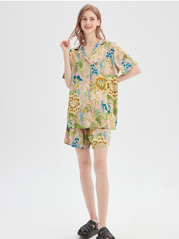 新款夏季薄款奢华丝绸睡衣短袖短裤冰丝洋气印花家居服套装
