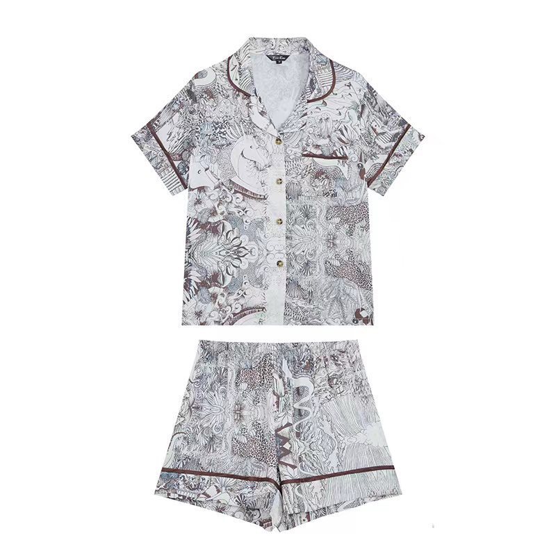 睡衣女春秋可外穿时尚印花两件套丝绸翻领套装短袖短裤复古家居服