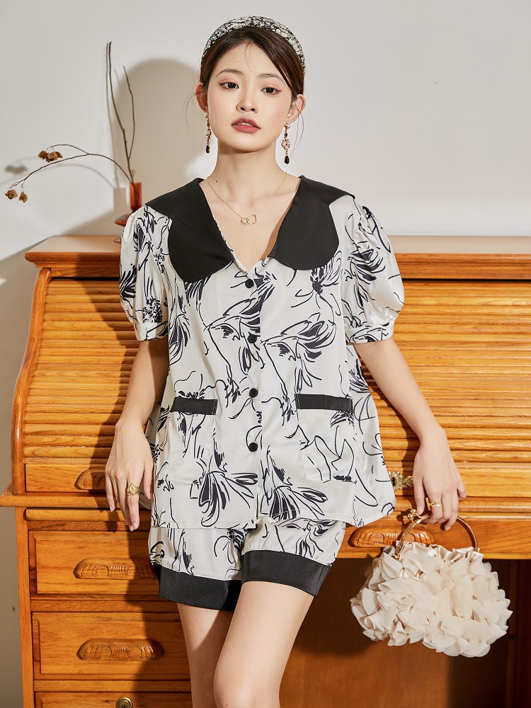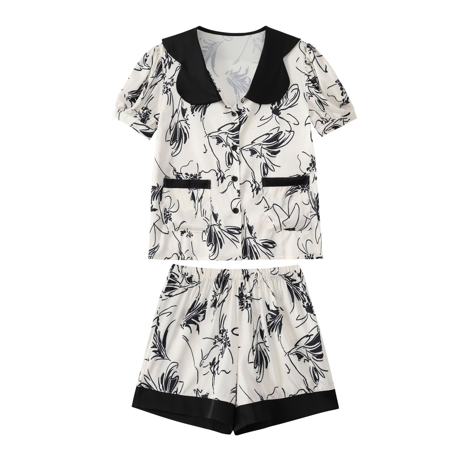 新款莫奈花园夏季印花可外穿冰丝短裤短袖睡衣女套装家居服