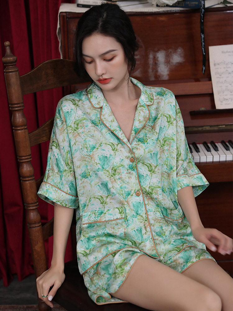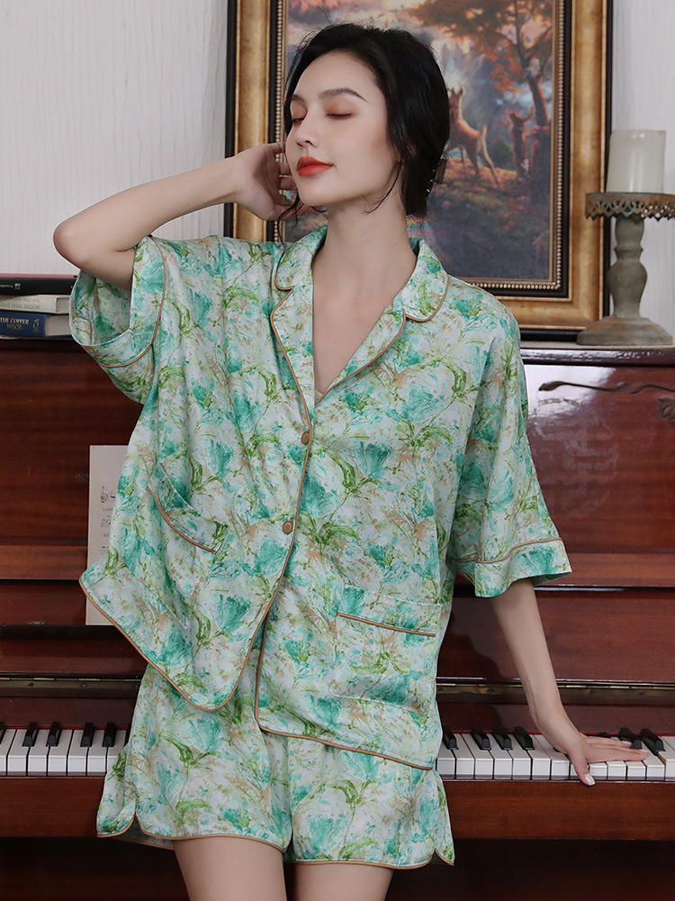 冰丝睡衣夏女薄款印花短袖短裤套装可外穿高级感丝绸家居服两件套