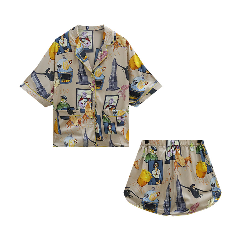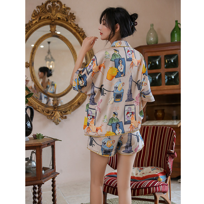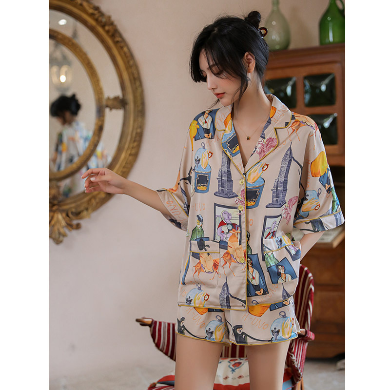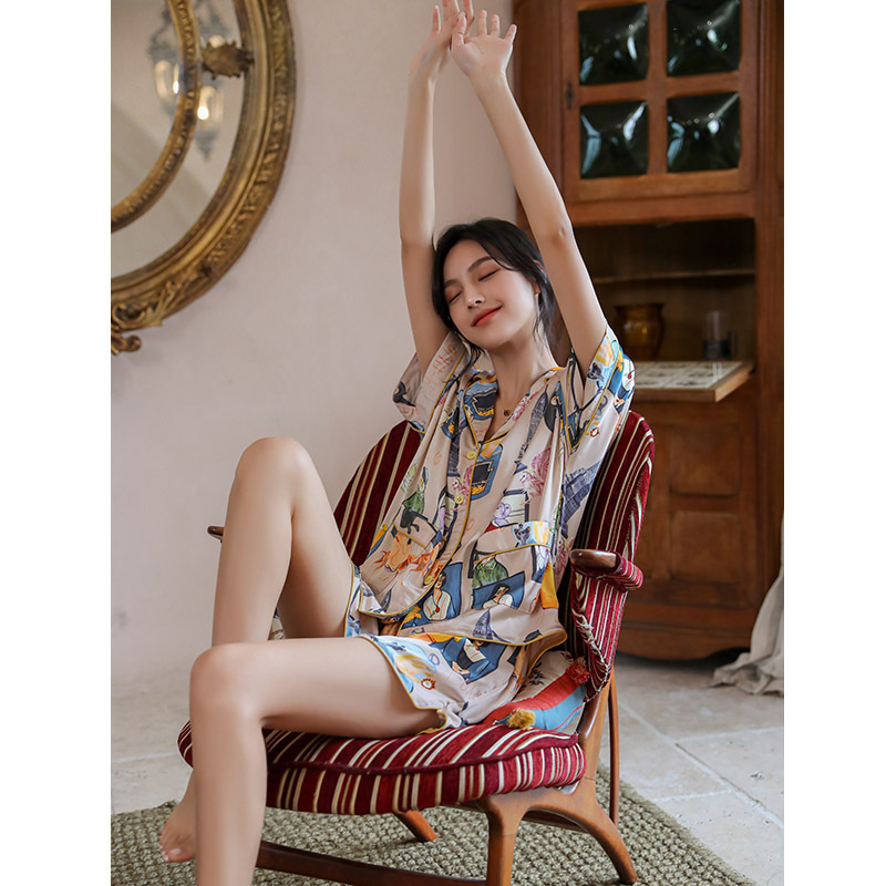 短袖冰丝睡衣女新款夏季薄款丝绸两件套个性印花家居服套装