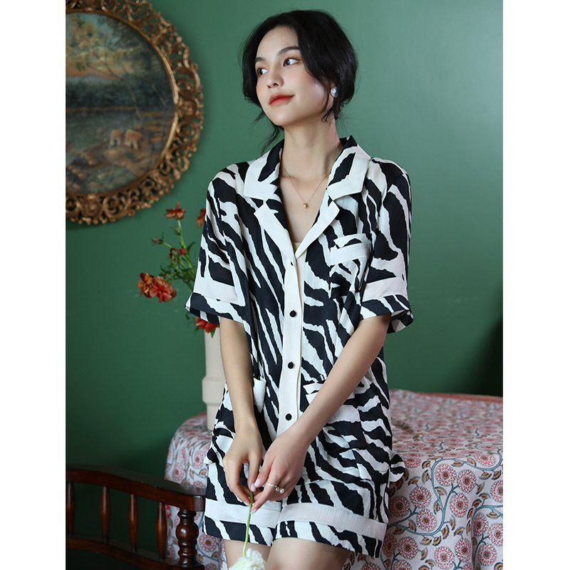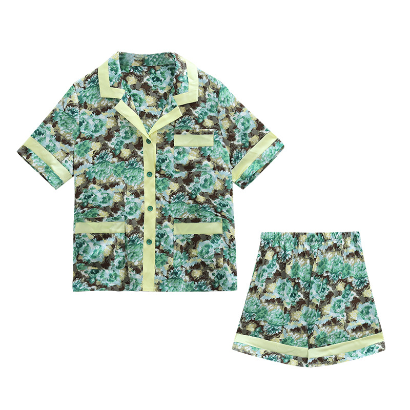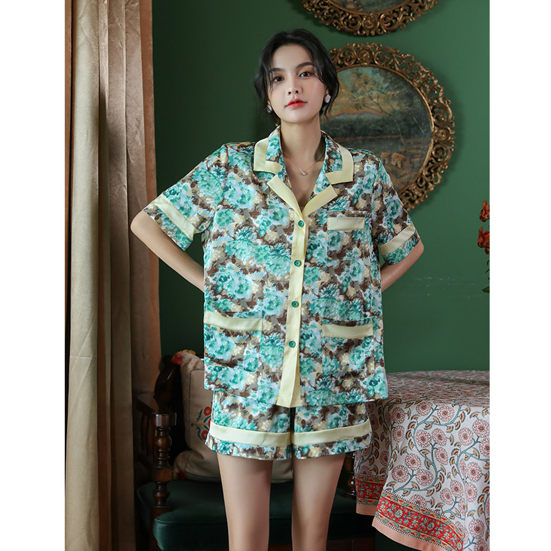 短袖睡衣女夏季冰丝两件套时尚丝绸套装新款印花家居服可外穿