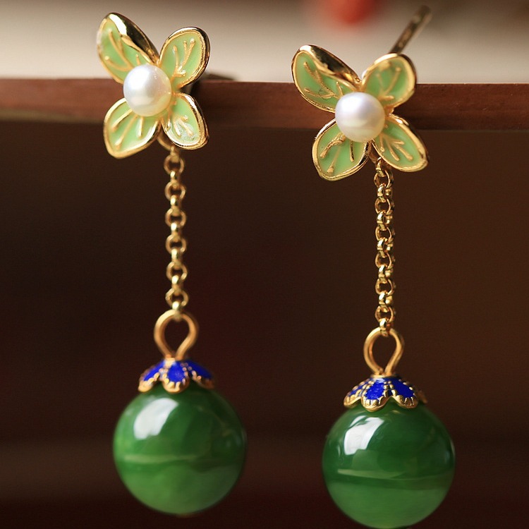 天然和田玉碧玉中国风珐琅四叶草花朵纯银耳环女夏耳坠耳饰
