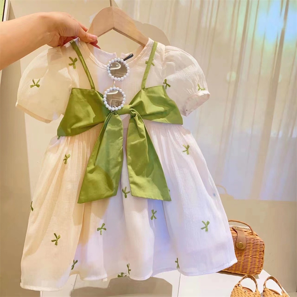 新品邻家小妹女童大蝴蝶结泡泡袖洋气公主连衣裙2025夏装