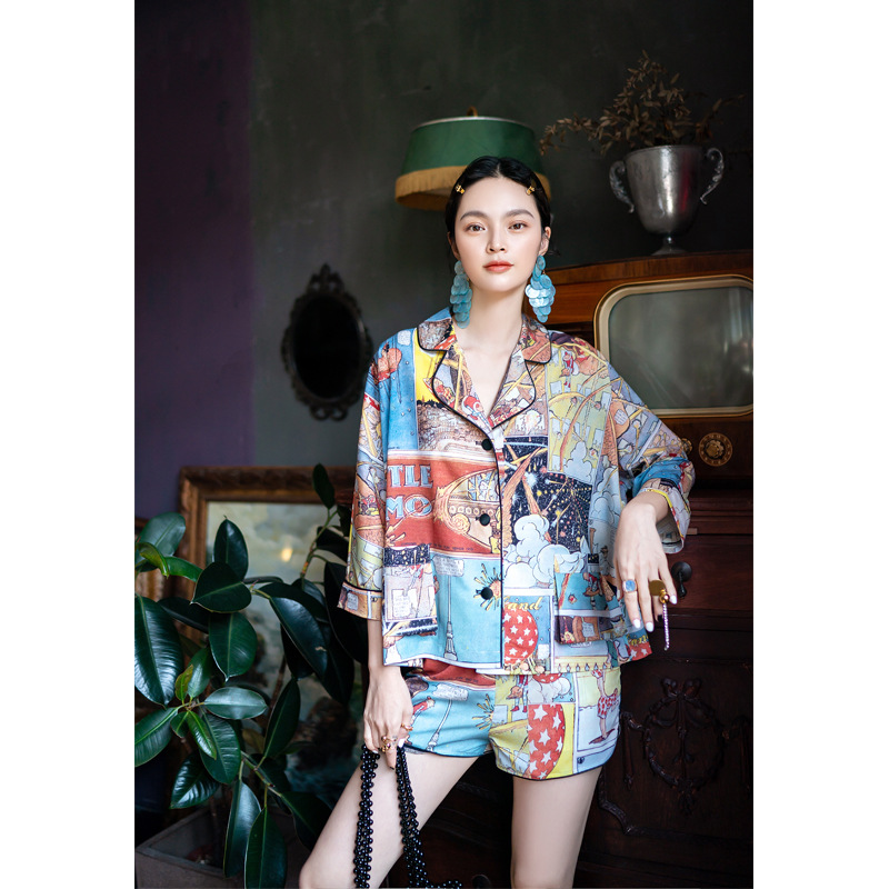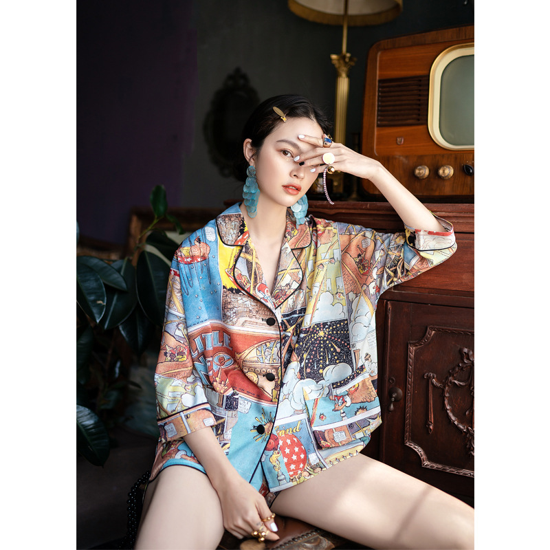 卡通夏季冰丝滑睡衣女春秋短袖薄款两件套家居服可出门外穿休闲
