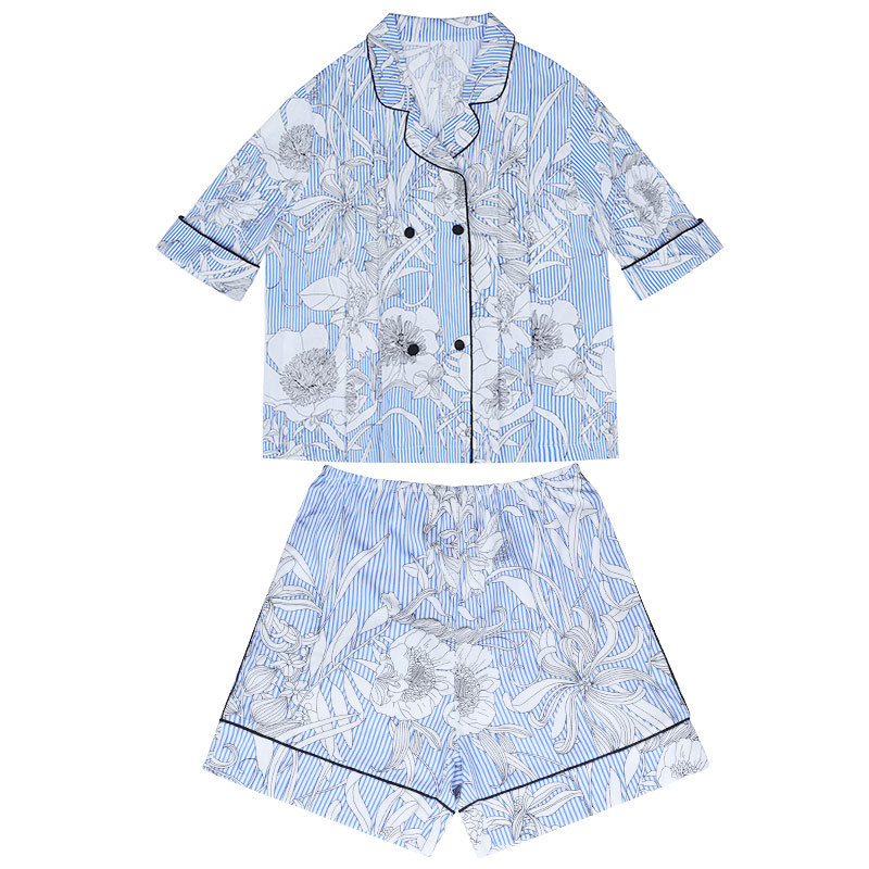条纹花朵冰丝睡衣女夏季薄短袖短裤件套装家居服可出门外穿休闲