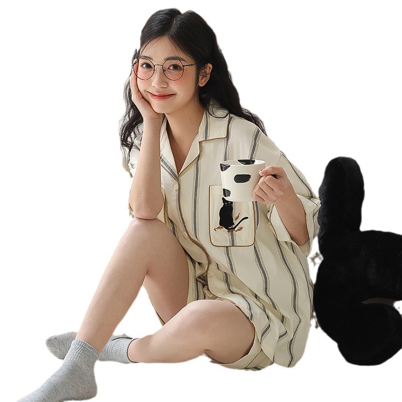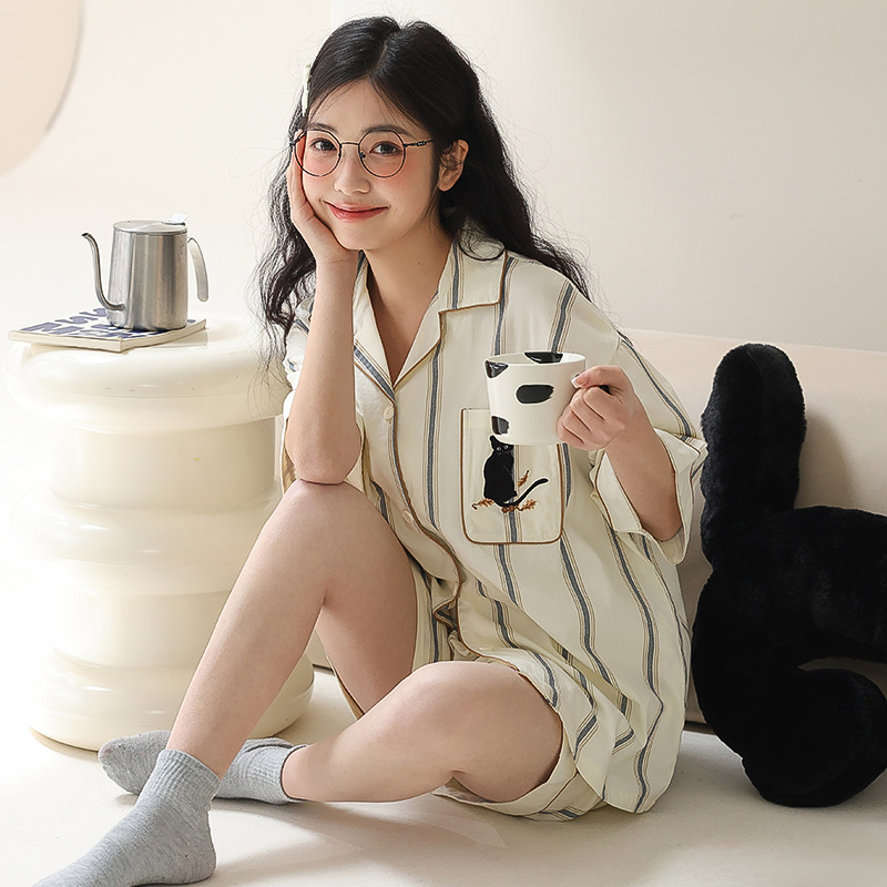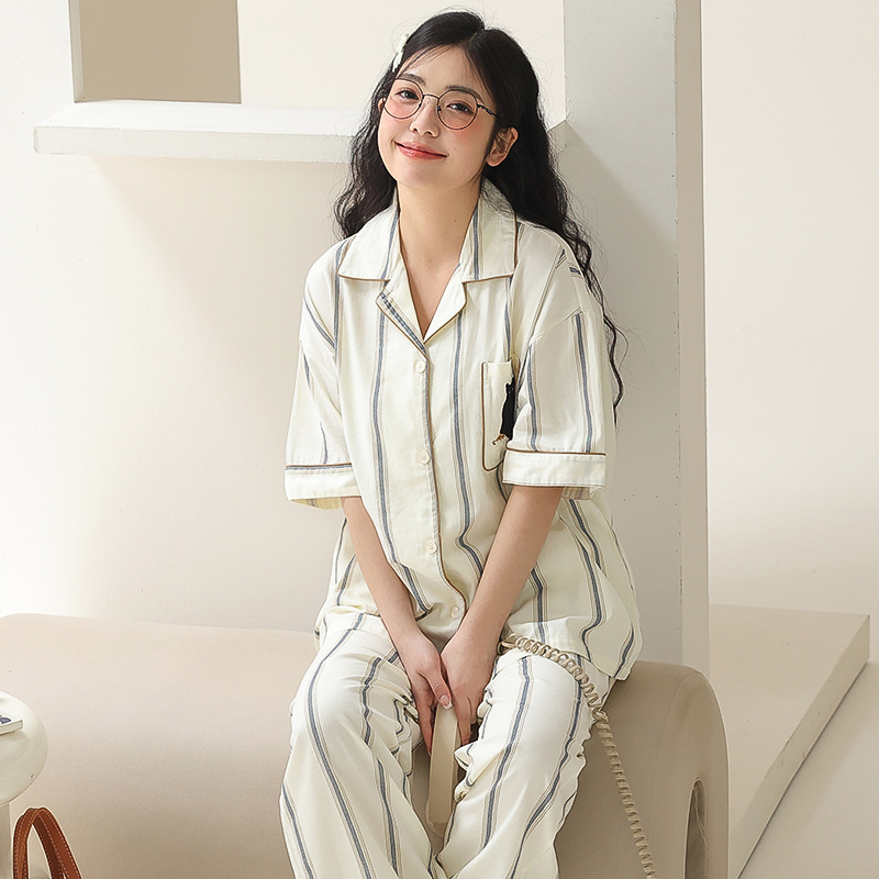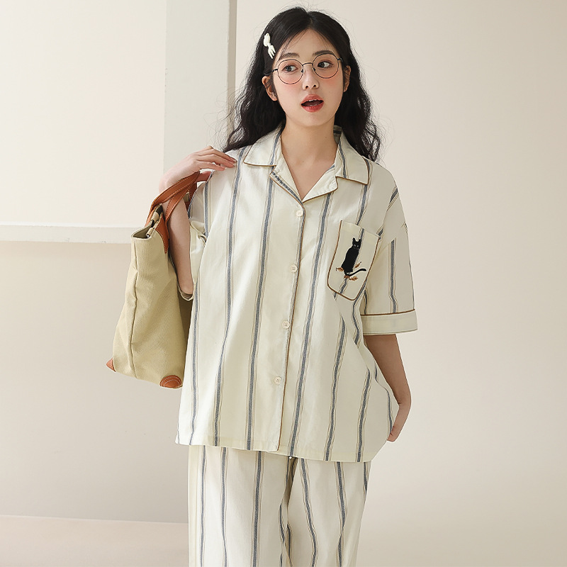 春夏新款落叶猫A类纯棉睡衣三件套简约条纹女士睡衣家居服可外穿