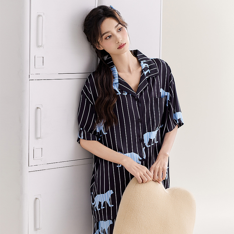 清冷蓝白豹子冰丝睡衣三件套薄款开衫ins风高级感家居服可外穿