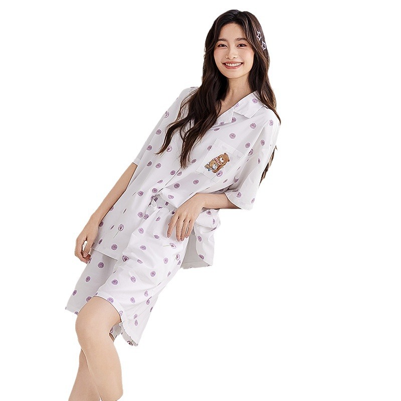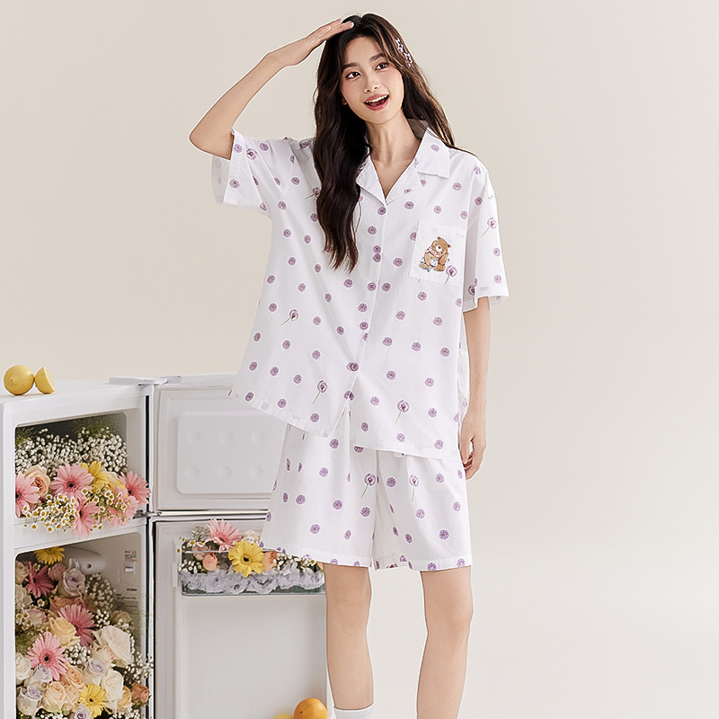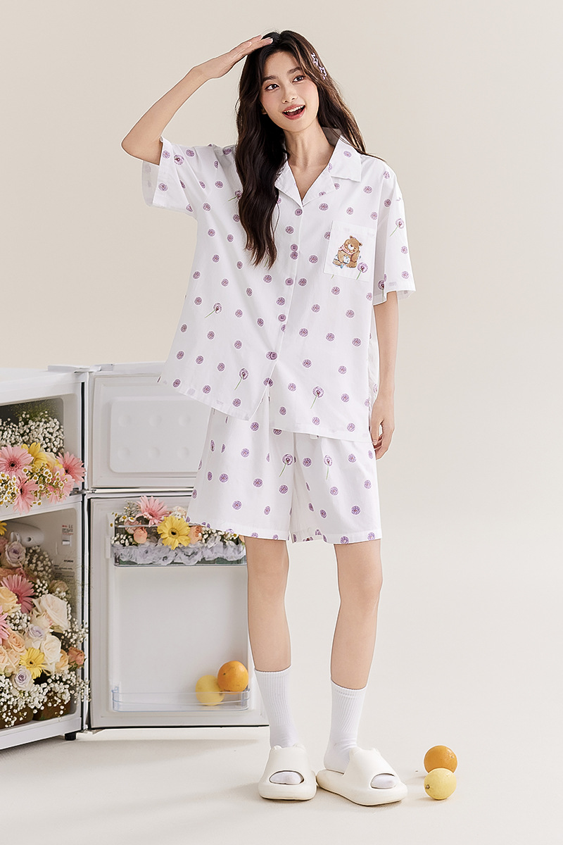 宅家舒适简约紫色蒲公英小熊ins风清新短袖短裤睡衣家居服可外穿
